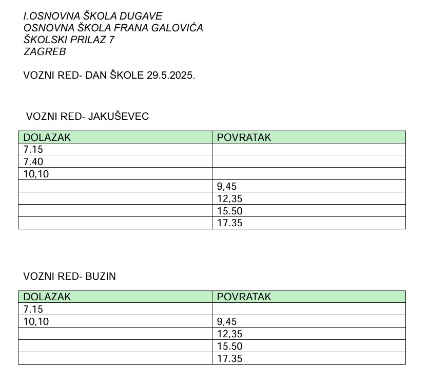 U četvrtak 29. svibnja 2025. obilježit ćemo Dan škole. Planirane aktivnosti za učenike počinju u 10:30 i završavaju u 12:30. Kako bismo omogućili svim učenicima da sudjeluju u proslavi i svim aktivnostima predviđenima za Dan škole, školski autobus će taj dan voziti po prilagođenom rasporedu.