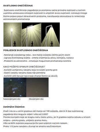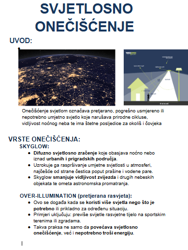 Međunarodni dan tamnog neba, u organizaciji International Dark-Sky Association (IDA), ne obilježava se na točno određen dan, već je to kampanja koja se provodi u određenom razdoblju. Ove godine International Dark Sky Week održava od 21. do 28. Travnja 2025. Cilj je podići svijest o važnosti očuvanja noćnog neba i potaknuti zajednice da preispitaju način na koji koriste rasvjetu. Učiteljica fizike je sa učenicima osmih razreda razgovarala o odgovornom osvjetljenju s ciljem razvijanja svijesti o važnosti očuvanja prirodnog noćnog okoliša. Organizirala je izradu plakata s temom svjetlosnog onečišćenja. Učenici su uočili primjere dobre i loše rasvjete, komentirali razlike te osmisliti prijedloge za poboljšanje rasvjete u svojoj kući, školi ili naselju.
