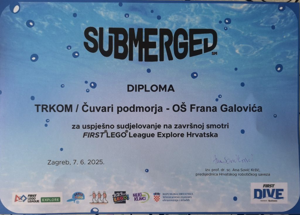 U subotu, 7. lipnja 2025. učenici prvih razreda izvannastavne skupine LEGO predstavili su našu školu i svoj cjelogodišnji istraživački projekt na državnoj smotri projekata First LEGO League u kategoriji Explore. Smotra se održala u OŠ Ivana Meštrovića u Zagrebu. Tim učenika nastupio je pod nazivom „TRKOM – Čuvari podmorja iz OŠ Frana Galovića“. Ovogodišnja tema za sve sudionike na svjetskoj razini bila je “SUBMERGED – zaronimo u podmorje”.