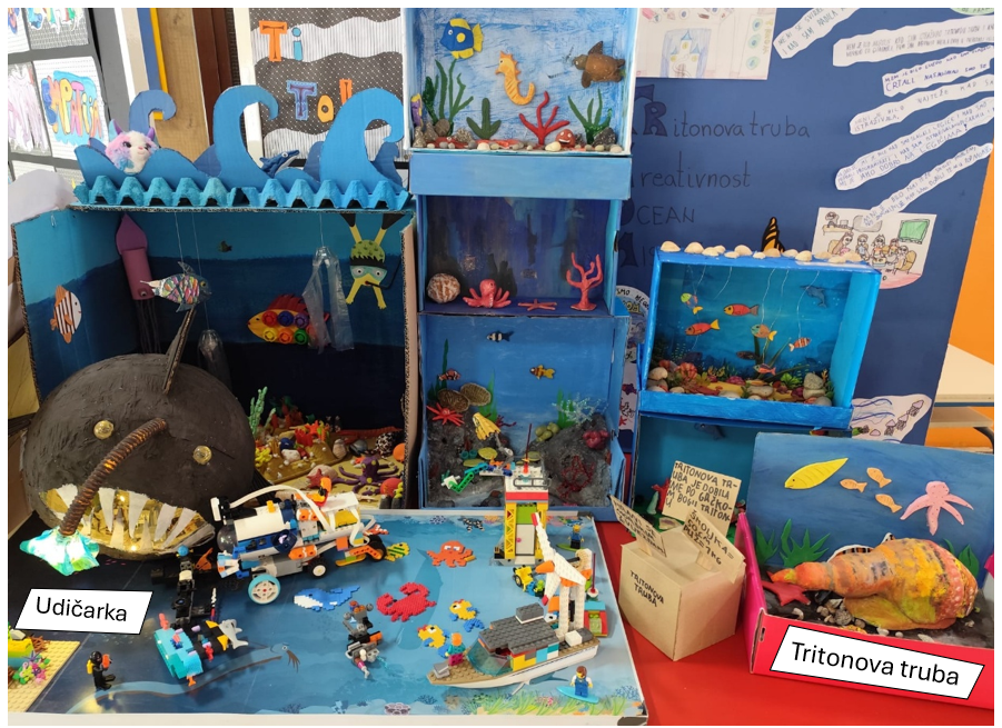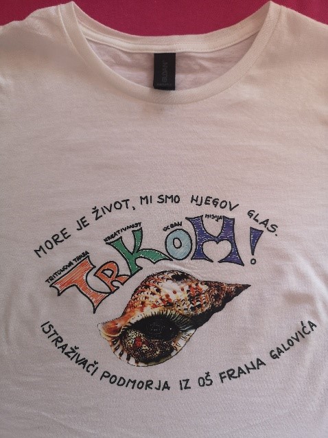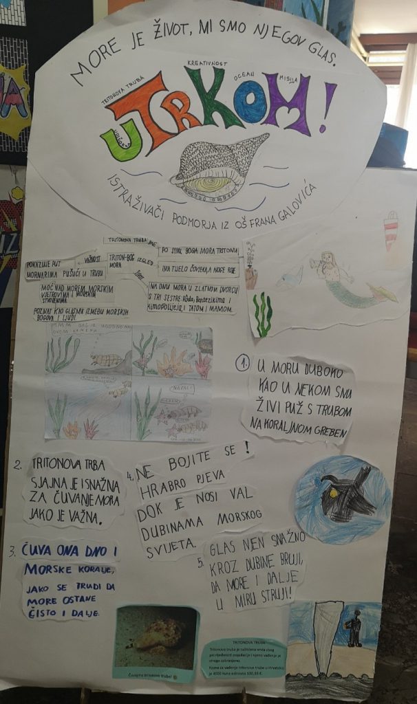 Istovremeno učenici sudjeluju u nacionalnom eTwinning projektu Ugrožene i zaštićene vrste u Jadranu ( https://school-education.ec.europa.eu/en/etwinning/projects/ugrozene-i-zasticene-vrste-u-jadranu/twinspace ). Naš tim istraživao je strogo zaštićenog morskog puža TRITONOVA TRUBA pa je i naziv tima u skladu s tim (TRiton, Kreativnost, Ocean, Misija – TRKOM).