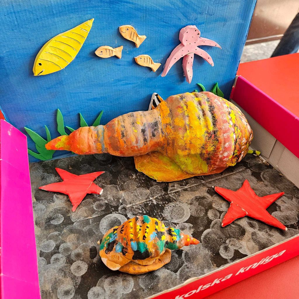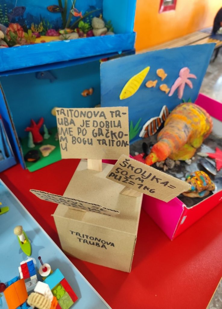 Model puža Charonia tritonis u prirodnoj je veličini (50 cm) modelirao učenik Ivan B. iz 1. b razreda. Najveći akvarij i model ribe udičarke modelirala je Jelena K. učenica 1. A razreda. Plakat i logo zajednički su rad učenika, učiteljice i AI Copilota koji nam je dao ideju ali pjesme još ne zna pisati. 😊