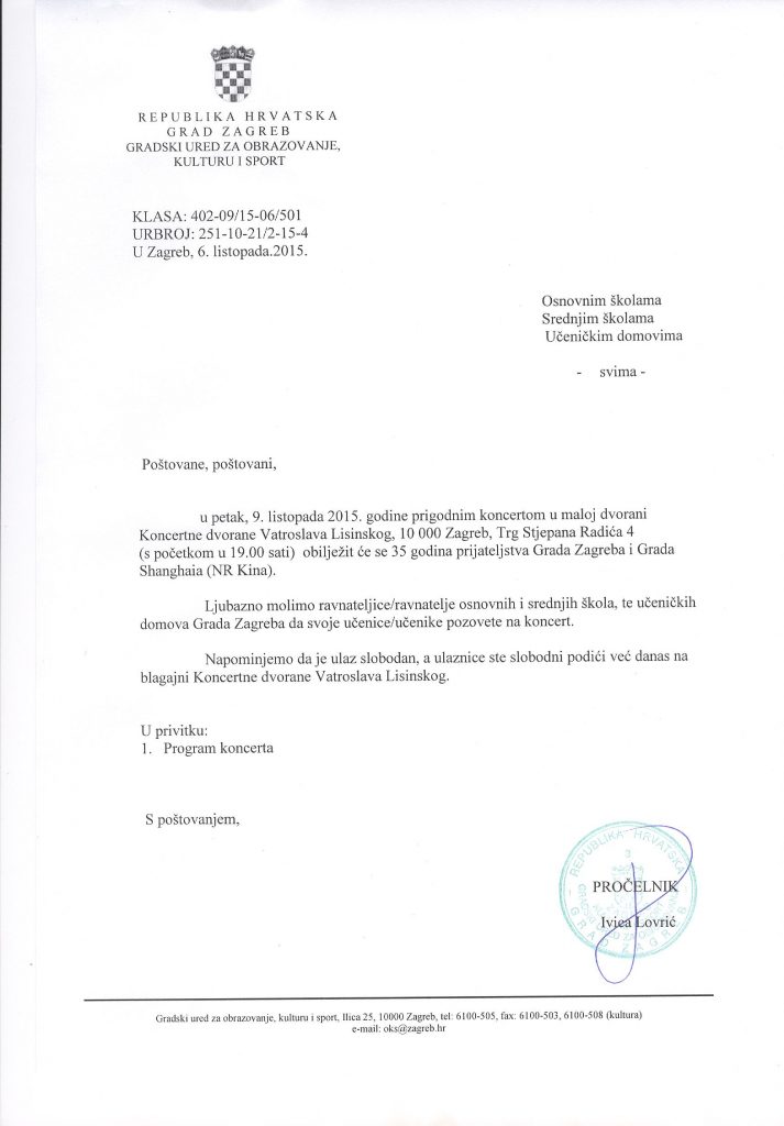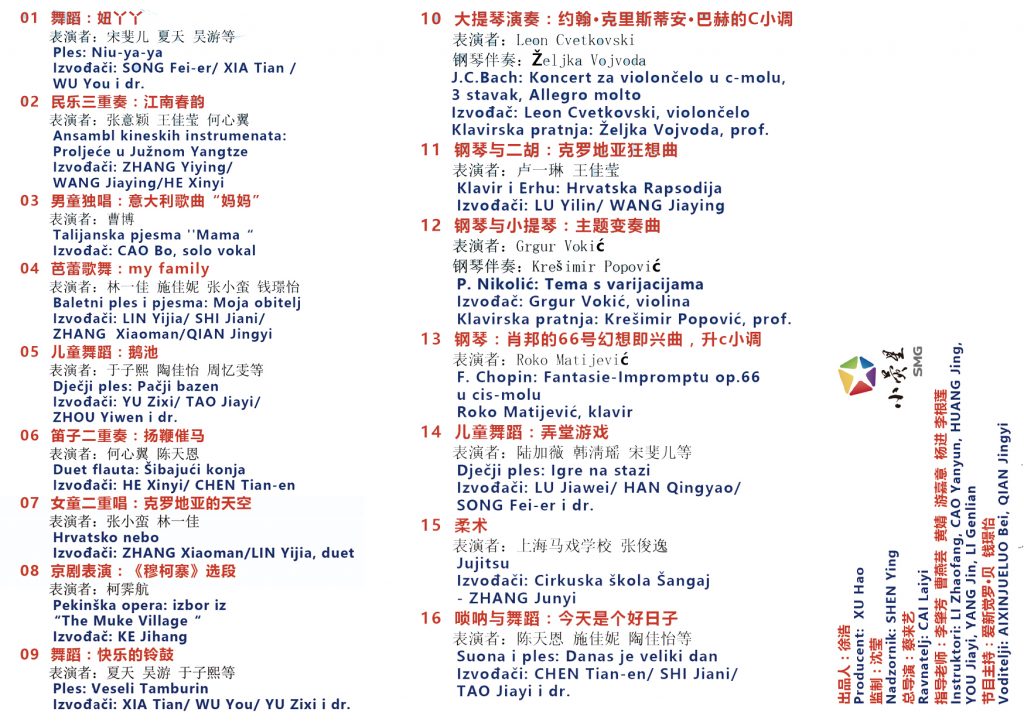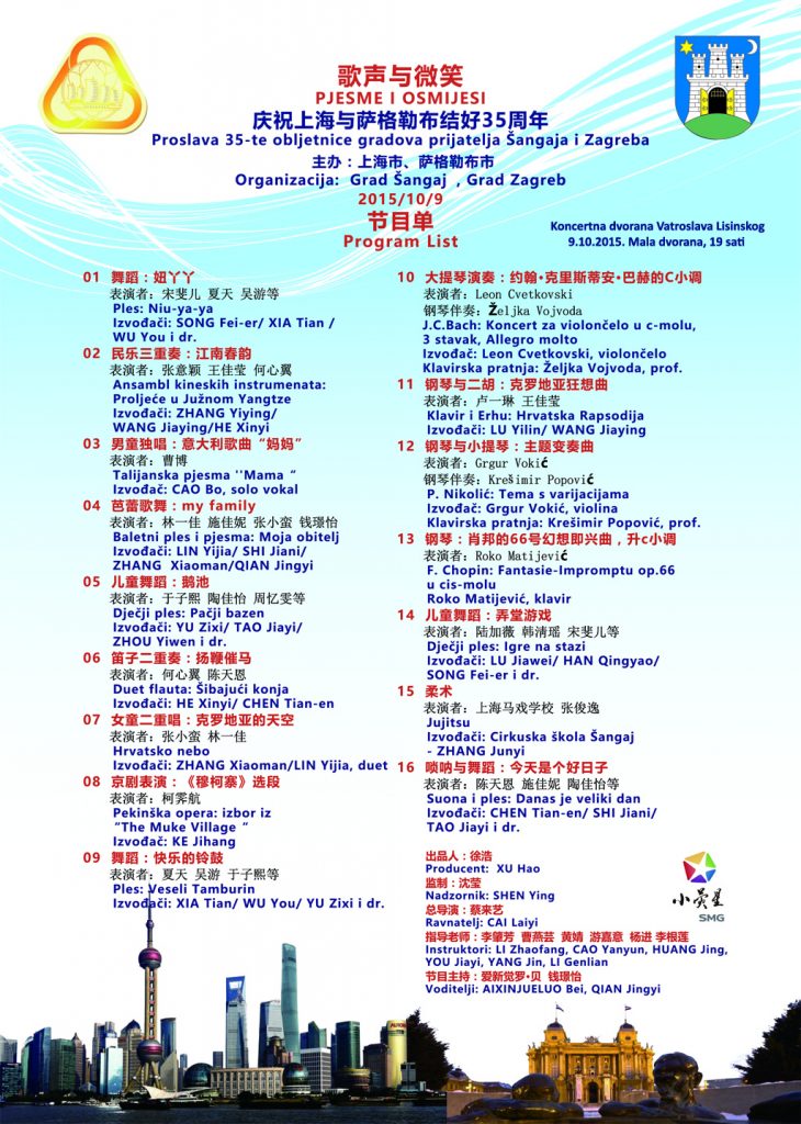 U 2015. godini Grad Zagreb i Grad Šangaj obilježavaju 35. godišnjicu prijateljstva. Na koncertu će se predstaviti djeca iz Šangajske „Little Star” škole, koja se bavi profesionalnim umjetničkim obrazovanjem djece s ciljem razvoja dječjih individualnih umjetničkih sposobnosti u dobi 3-12 godina. Škola je rasprostranjena kroz 15 šangajskih regija te kroz učenje im pomaže da razviju samopouzdanje, kreativnost te da stvore novu generaciju umjetničkih dostignuća. Uz njih, na koncertu će se predstaviti i tri mlada hrvatska glazbenika, Leon Cvetkovski, čelist, učenik GU Elly Bašić u klasi prof. Bernarde Debuš-Redžić, Grgur Vokić, violinist, učenik GŠ Vatroslav Lisinski u klasi prof. Mirte Pleteršek i Roko Matijević, učenik GŠ Zlatka Balokovića u klasi prof. Nenada Kačara.