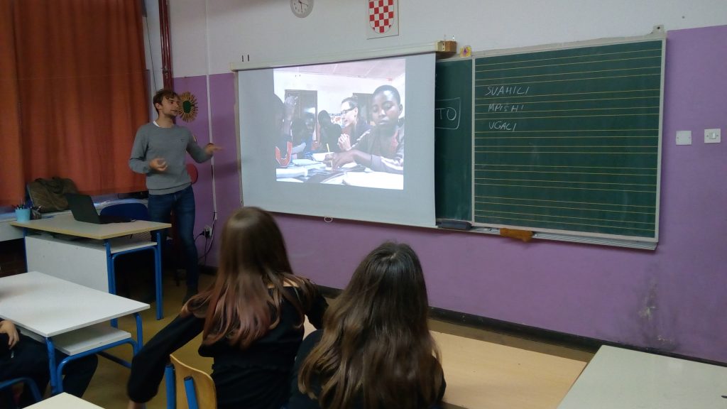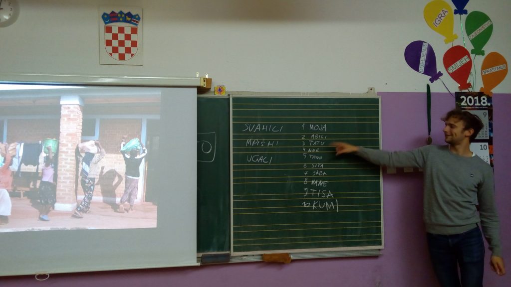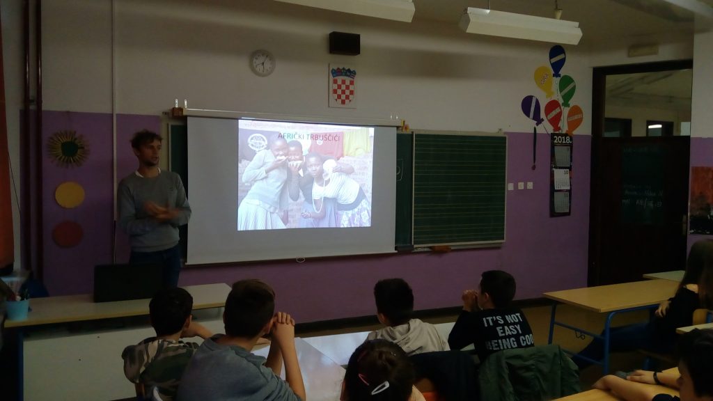 Luka nam je ispričao svoja iskustva volontiranja u sirotištu sv. Ante u Tanzaniji (Afrika) te opisao kako izgleda jedan tipičan dan u sirotištu. Slušajući o djeci koja žive sretno u skromnim uvjetima zahvaljujući ljudima velikog srca, shvatili smo da sami ne znamo cijeniti ono što imamo i da nikad nismo zadovoljni. Ono što mi smatramo pod normalno (hrana, voda, struja) nedostaje u nekim dijelovima svijeta te na tome trebamo biti zahvalni. Uz dinamično predavanje učenici su naučili brojati do 10 na svahili jeziku.