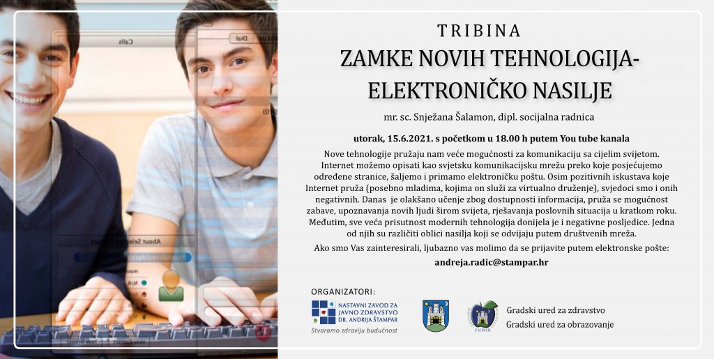 pozivamo vas na tribinu za roditelje na temu „Zamke novih tehnologija – elektroničko nasilje“ u organizaciji Nastavnog zavoda za javno zdravstvo dr. Andrija Štampar .