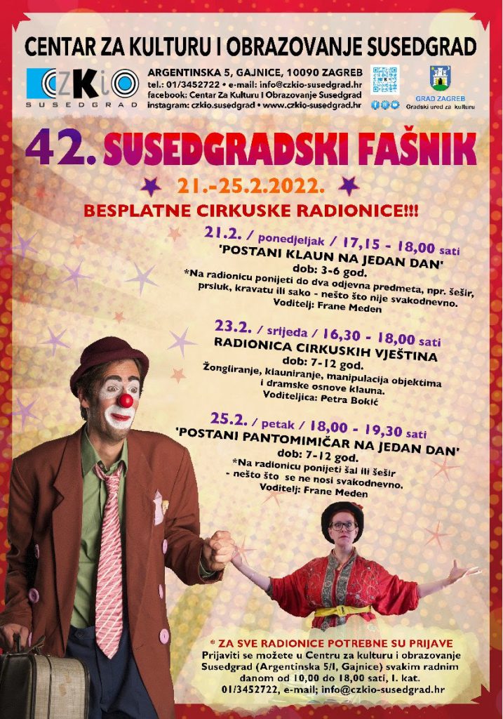 Centar za kulturu i obrazovanje Susedgrad priredio je za djecu pregršt klaunovskih ludorija u Centru za kulturu i obrazovanje Susedgrad, Argentinska 5, Gajnice u tjednu od 21. do 25. veljače 2022.