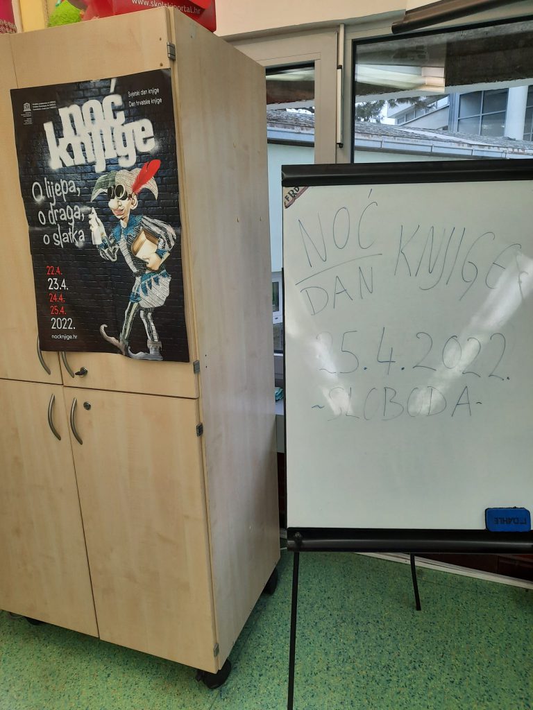 Noć knjige smo obilježili po povratku s proljetnih praznika 25. travnja 2022. Kroz dan su bile organizirane radionice za učenike, a sudjelovali su učenici nižih razreda škole.