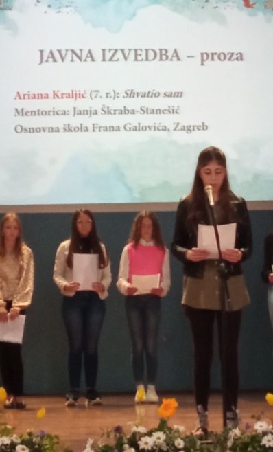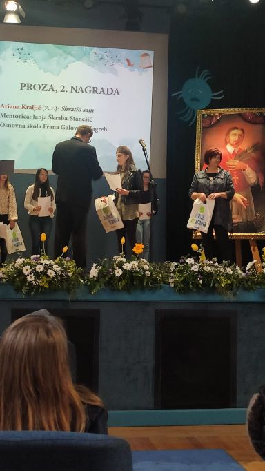 Ariana Kraljić, učenica 7.d razreda je osvojila 2. nagradu stručnog ocjenjivačkog suda u žanru proze, mentorica vjeroučiteljica Janja Škraba-Stanešić, na Susretu hrvatskoga dječjeg duhovnog stvaralaštva „Stjepan Kranjčić” za književno i likovno stvaralaštvo učenika osnovnih škola u Republici Hrvatskoj.