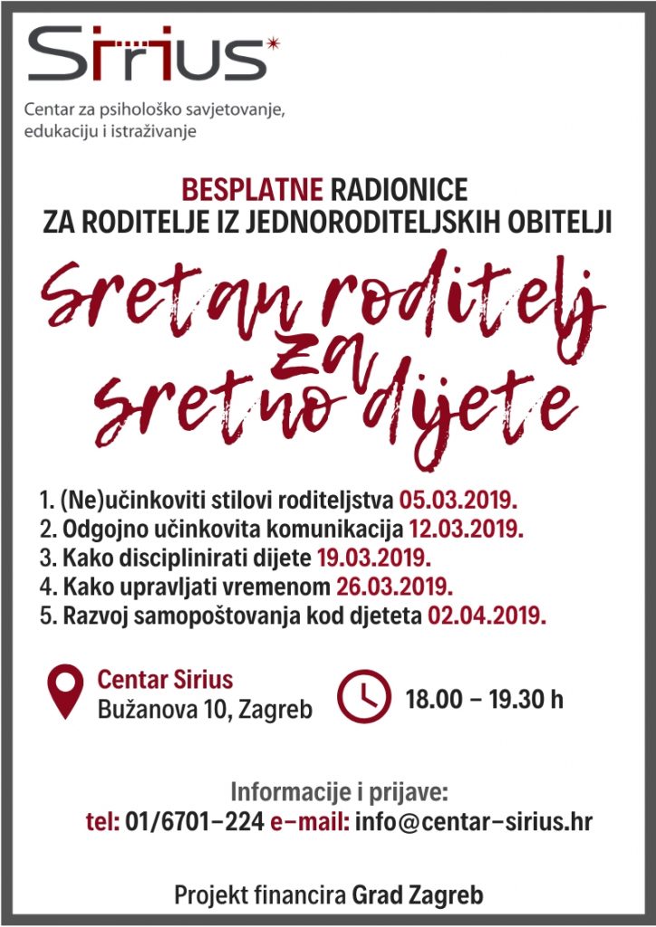 u sklopu projekta “Sretan roditelj za sretno dijete”, koji za cilj ima povećanje kvalitete življenja jednoroditeljskih obitelji provodi se ciklus radionica za roditelje.