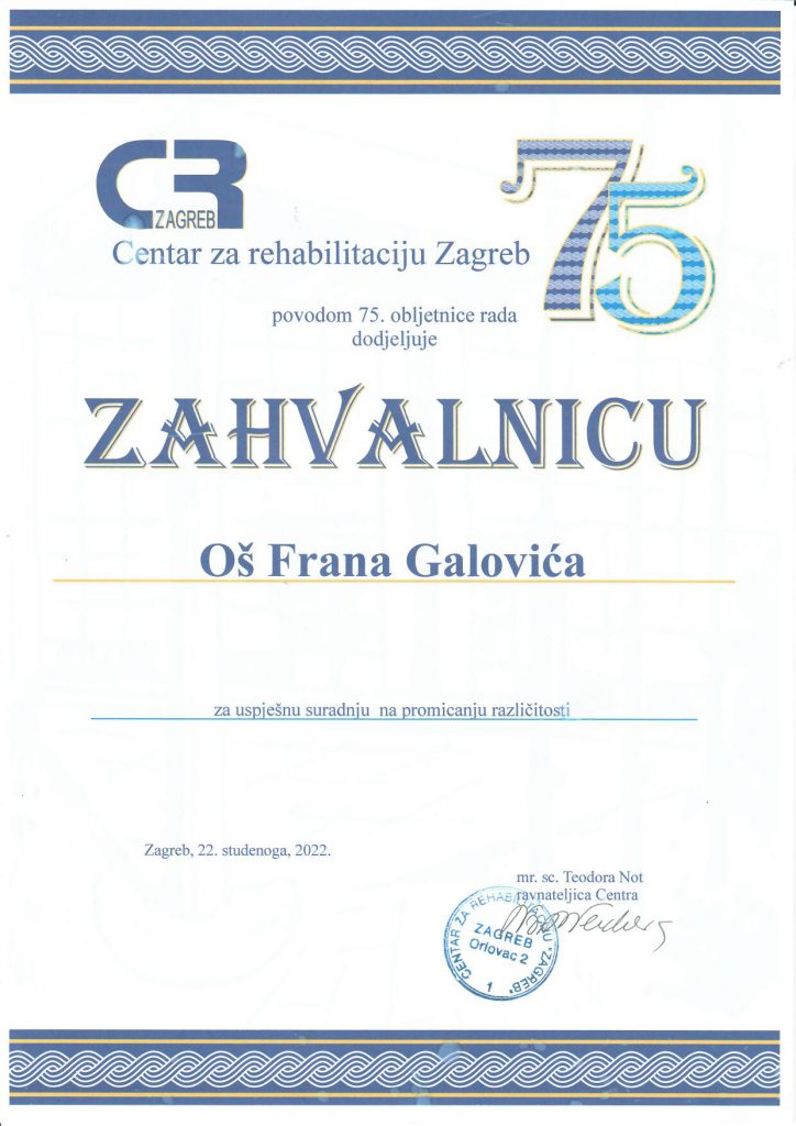 Pod pokroviteljstvom Ministarstva rada, mirovinskog sustava, obitelji i socijalne politike Republike Hrvatske dana 22.studenog u hotelu Westin, Centar za rehabilitaciju Zagreb, povodom obilježavanja 75.obljetnice rada, OŠ Frana Galovića dodijelio je zahvalnicu za uspješnu suradnju na promicanju različitosti.