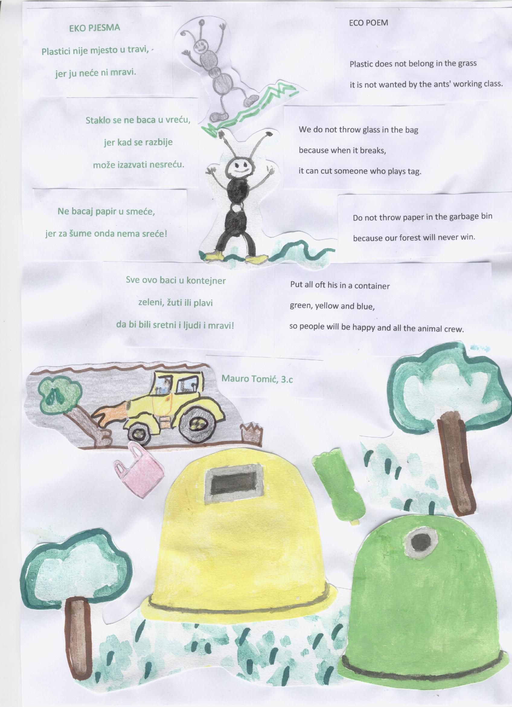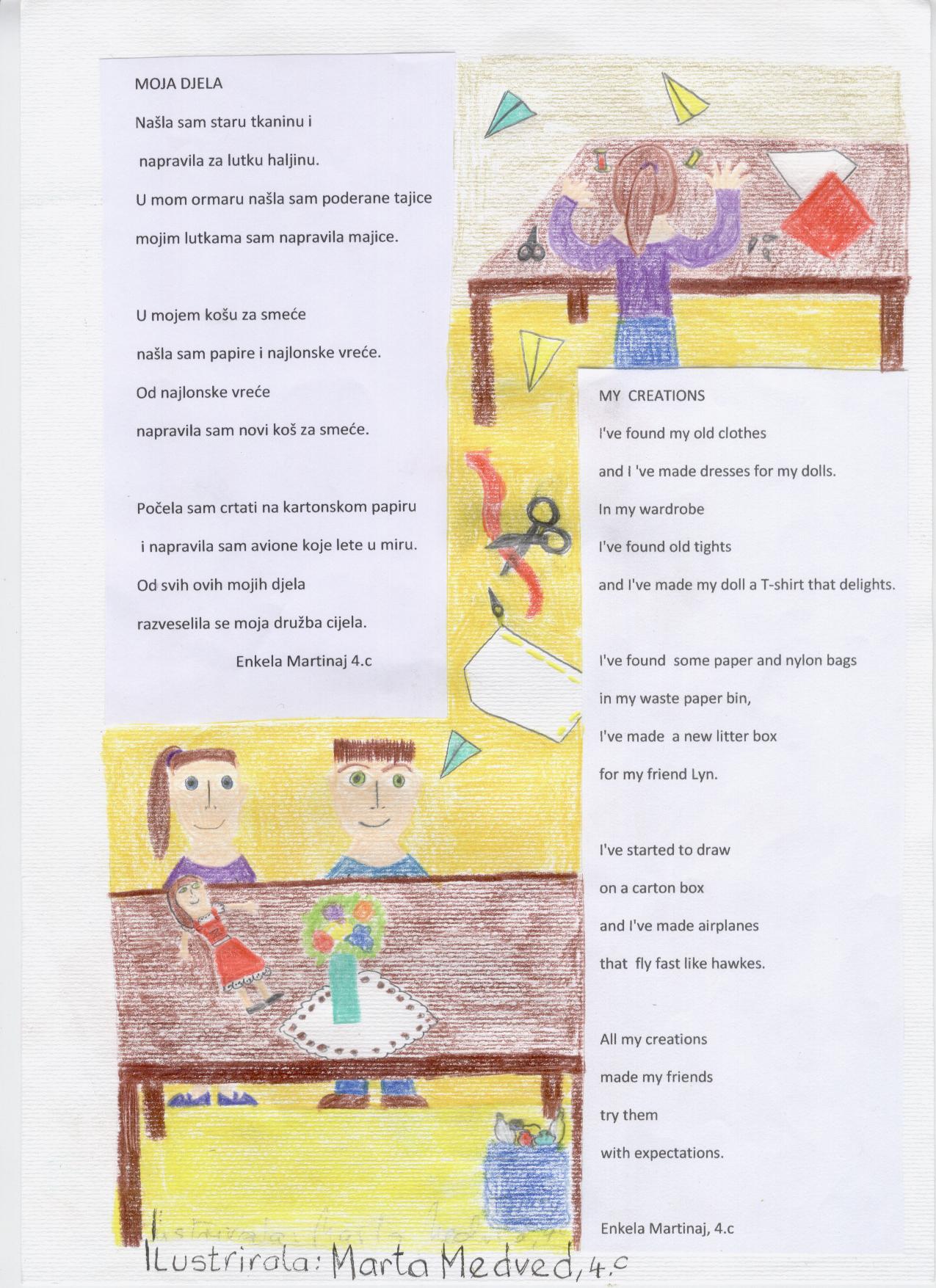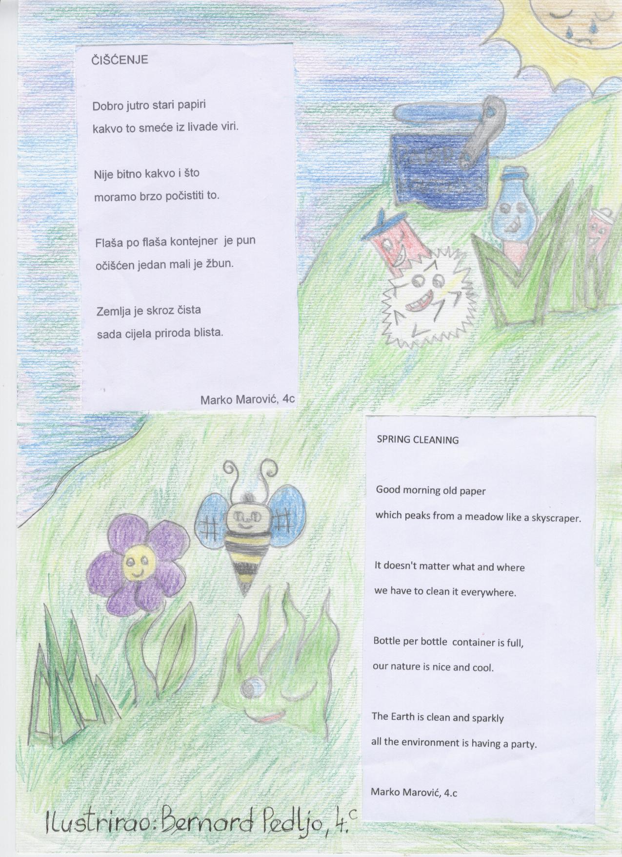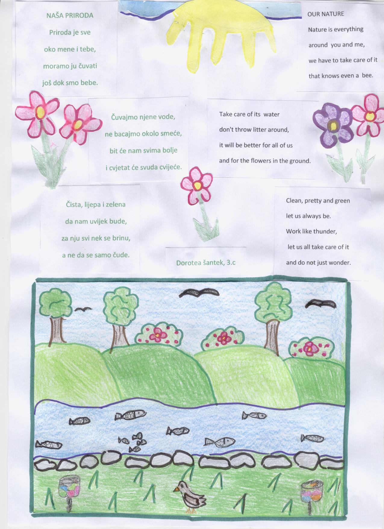 One of the last activities in our Comenius project is creating a book of poems about enviroment. Students from grades 3.c and 4.c wrote poems in Croatian language and with a little help from their English teacher they translated them into English language. They also made beautiful illustrations. Our poems will be part of a Comenius book of poems and you can see them below.