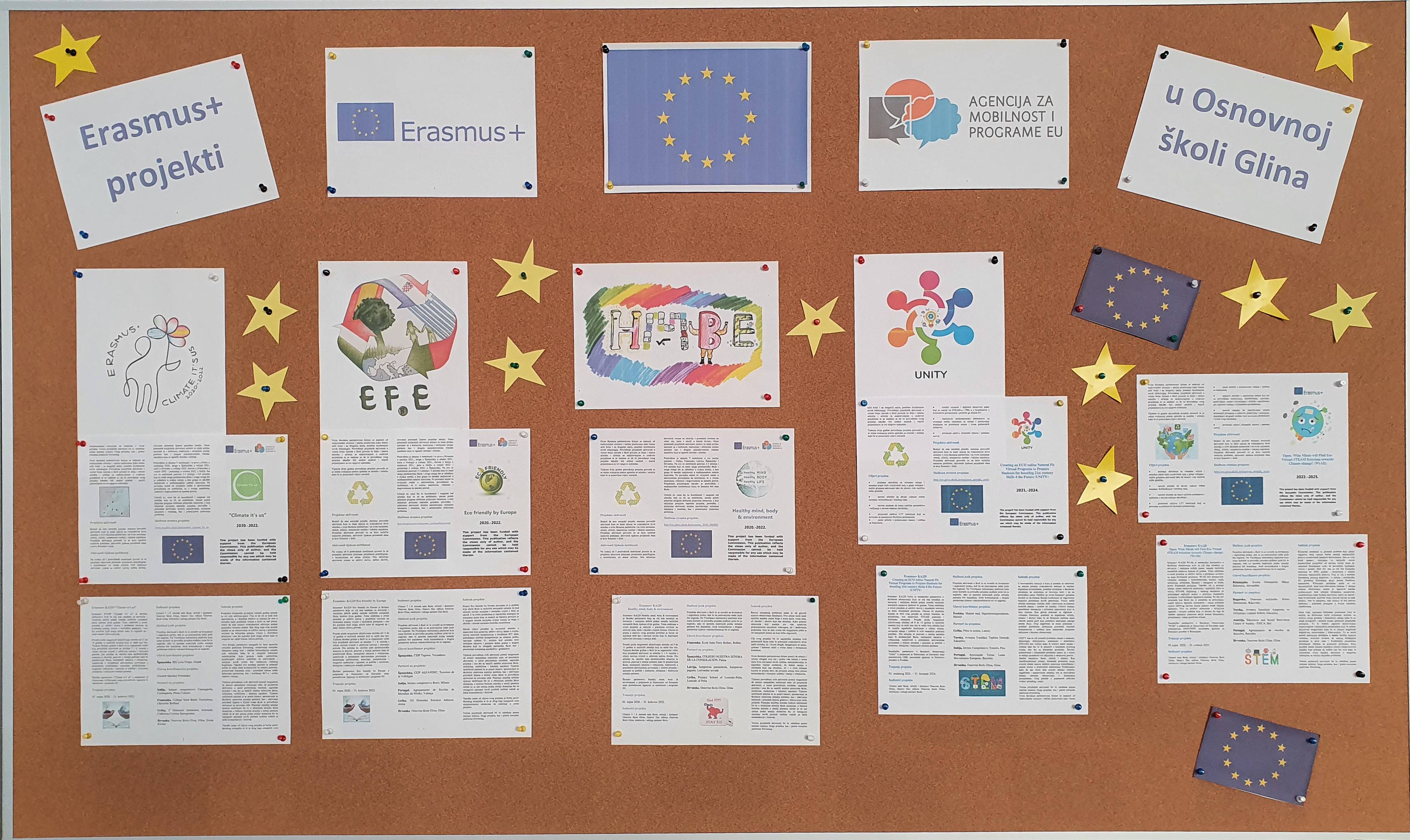 Osnovna škola Glina od rujna, 2022. do svibnja, 2025. sudjelovat će u Erasmus+ projektu "Open: Wide Minds will Find Eco Virtual STEAM Solutions towards Climate change! (Wi-Mi)". U ovom projektu škola će surađivati s još 5 europskih partnera iz Rumunjske, Bugarske, Turske, Austrije i Portugala.