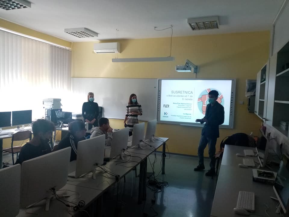 Pitanje osoba s invaliditetom u našem društvu vrlo je često povezano s njihovim pravima, ali se nedovoljno pažnje usmjerava na podizanje svijesti i znanja o toj temi u čitavom društvu. Stoga je razvijena i javno objavljena ozbiljna igra Susretnica. Učenici 7.a i c i 5. a razreda imali su priliku testirati aplikaciju Susretnica. Zahvaljujemo Fakultetu elektronike i računarstva te agenciji HAKOM što su u našoj školi testirali aplikaciju Susretnica.