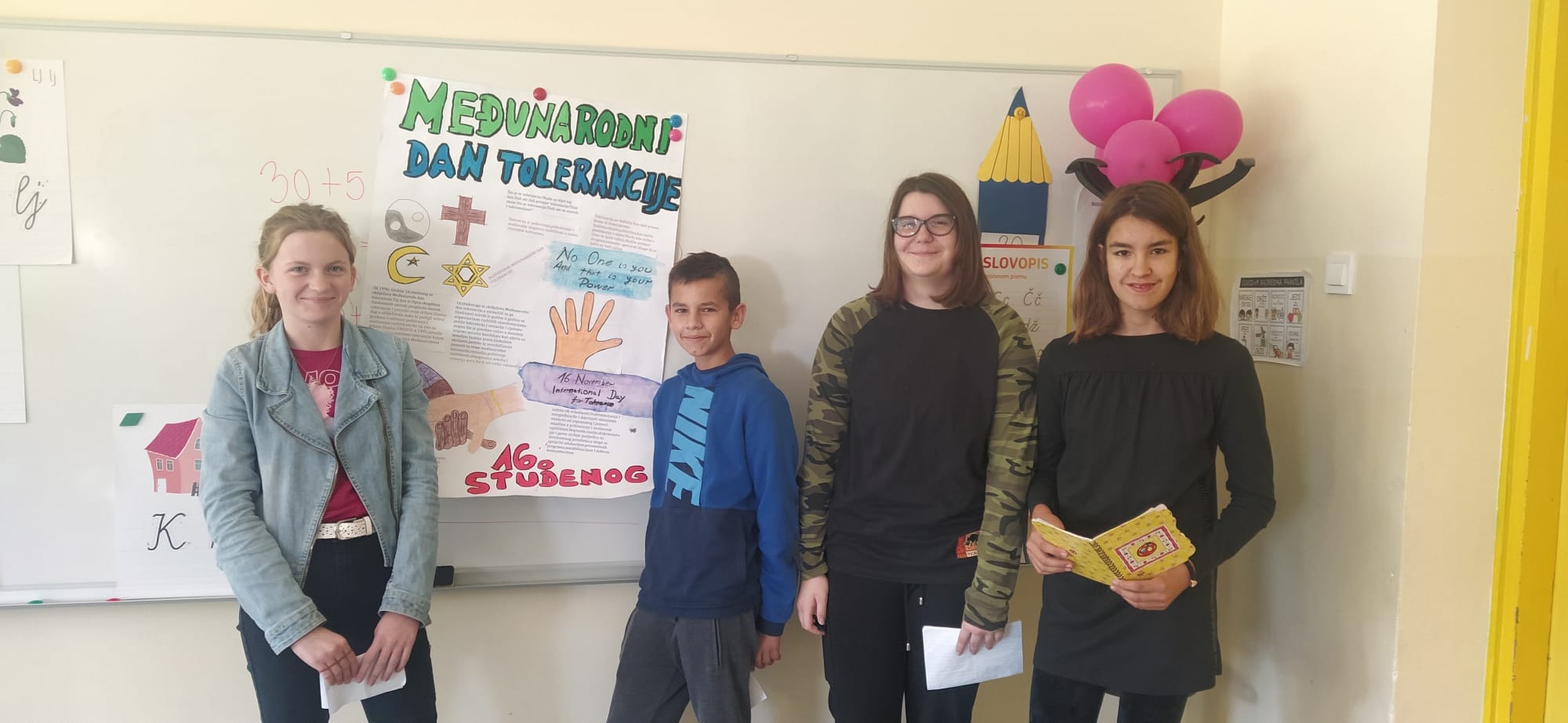 Učenici 7.c razreda uz vodstvo svoje razrednice Vesne Netoušek održali su prezentaciju o Međunarodnom danu tolerancije svim učenicima od 1. do 8. razreda B smjene. Posjetili su učenike na njihovom satu razrednog odjela te na zanimljiv način koristeći plakate i prezentacije objasnili što je tolerancija i kad se obilježava. Međunarodni dan tolerancije se obilježava 16.11. svake godine. Tolerancija je poštivanje, prihvaćanje i uvažavanje bogatstva različitosti, naša forma izražavanja i način da budemo ljudi!