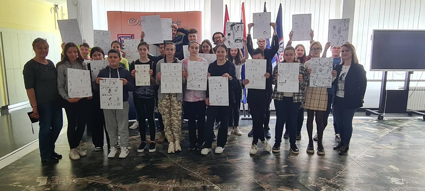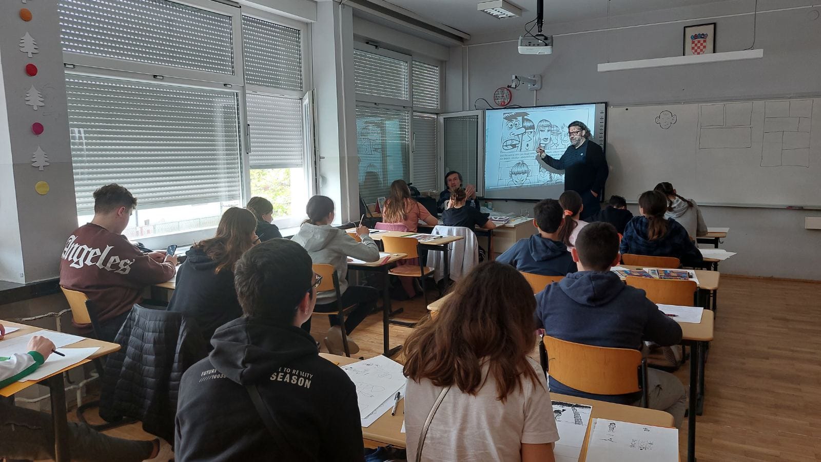 29. travnja u suradnji s Udrugom Ljudi za ljude ugostili smo gospodina Dalibora Talajića jednog od svjetskih crtača stripova, najpoznatijeg po svom radu za najveću izdavačku strip kuću Marvel Comics. Iako je radionica bila u subotu, djeca su se rado odazvala, naučila što je potrebno za nacrtati čitljiv i zanimljiv strip. Imali su priliku pokazati naučeno te nacrtati svoj strip u 9 kadrova prateći zadani scenarij. U ugodnom i kreativnom ozračju nastali su kvalitetni stripovi. Zahvaljujemo gospodinu Daliboru Talajiću i njegovom suradniku Tihomiru Tikulinu Tici što su djeci približili medij stripa kao vizualnog sredstva komunikacije.