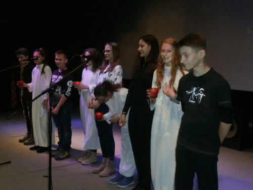 Sudeći prema reakcijama publike, naši su se učenici pokazali u sjajnom svjetlu glumačke karijere, a to je potvrdio i gromoglasan pljesak koji se orio iza svake recitacije i predstave.