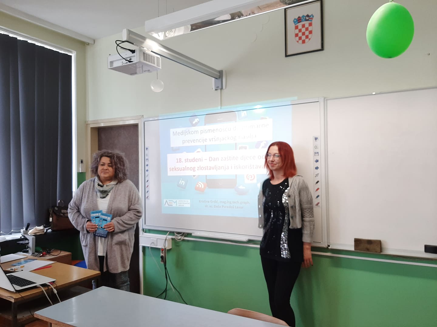 U okviru projekta "Medijskom pismenošću do primarne prevencije vršnjačkog nasilja" učenici 8.c i 8.d danas su nazočili predavanju dr.sc. Daše Poredoš Lavor iz Građanske inicijative "Moj grad Sisak" i Kristine Grdić, mag.ing.tech.graph. te obilježili Dan zaštite djece od seksualnog zlostavljanja i iskorištavanja. Ciljevi predavanja bili su podučiti učenike kako odgovorno koristiti društvene mreže, upoznati ih s različitim situacijama neprimjerenoga ponašanja na internetu, utvrditi pravila poželjnoga ponašanja na internetu, podučiti kako zaštititi i poštivati druge s ciljem prevencije vršnjačkog nasilja i poticati razvoj prijateljstva u osobnim susretima te kome se obratiti u slučaju izloženosti nasilju putem interneta.