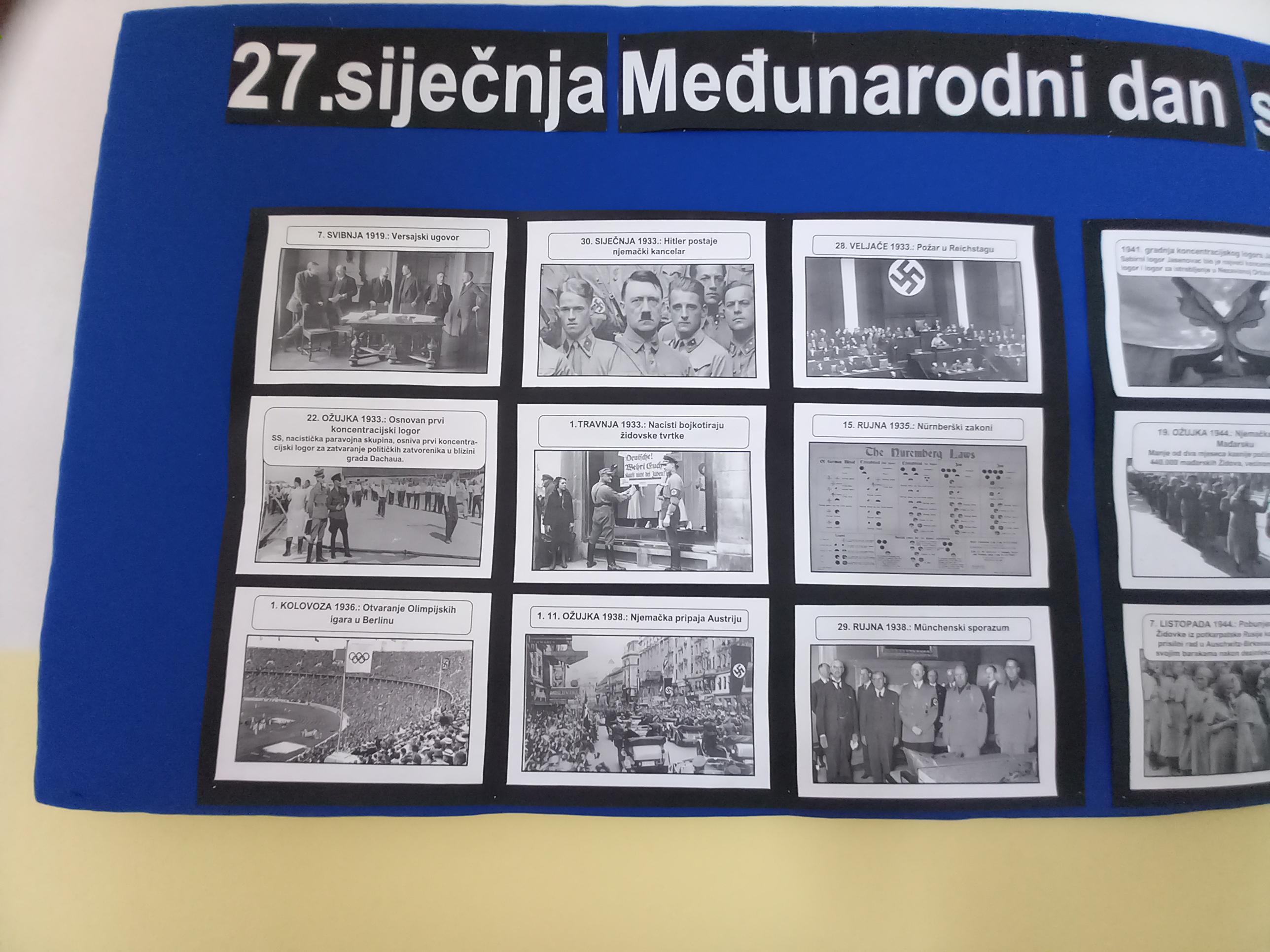 Učenici 5. i 8. razreda na satu povijesti i građanskog odgoja obilježili su Međunarodni dan sjećanja na žrtve holokausta (27. siječnja). Učiteljica Nikolina Sukalić Rom putem PPT prezentacije upoznala je učenike sa značenjem tog datuma i zbivanjima u periodu od 1933. do 1945. godine.