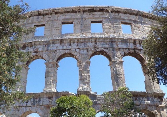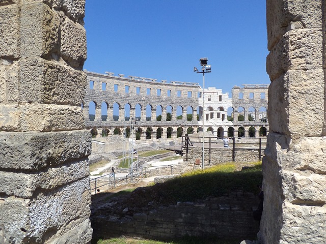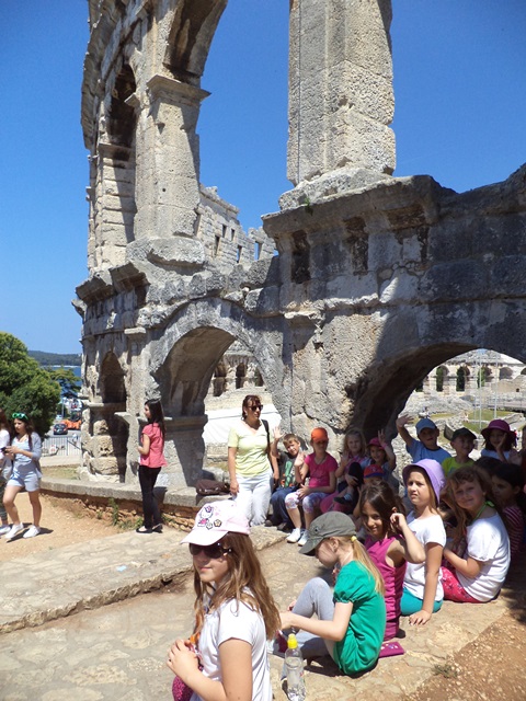 Najprije smo obišli rimski amfiteatar i fotografirali se ispred njega. Neki od nas su kupili suvenire pulske arene. Nakon razgledavanja arene odšetali smo se do parka podno nje. Tamo smo vidjeli maketu grada Pule. Tu smo se kratko zaustavili, razgledali maketu i slikali ju. Zatim smo se prošetali do Dvojnih vrata koji je jedan od ulaza u Austro-ugarske podzemne hodnike.