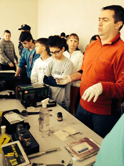 Poslije su nam pokazali policijsku opremu kao što su: kaciga, pancirka, puška i druga tehnika. Nakon toga su nam pokazali kako se uzimaju otisci i uzorak za DNK analizu.