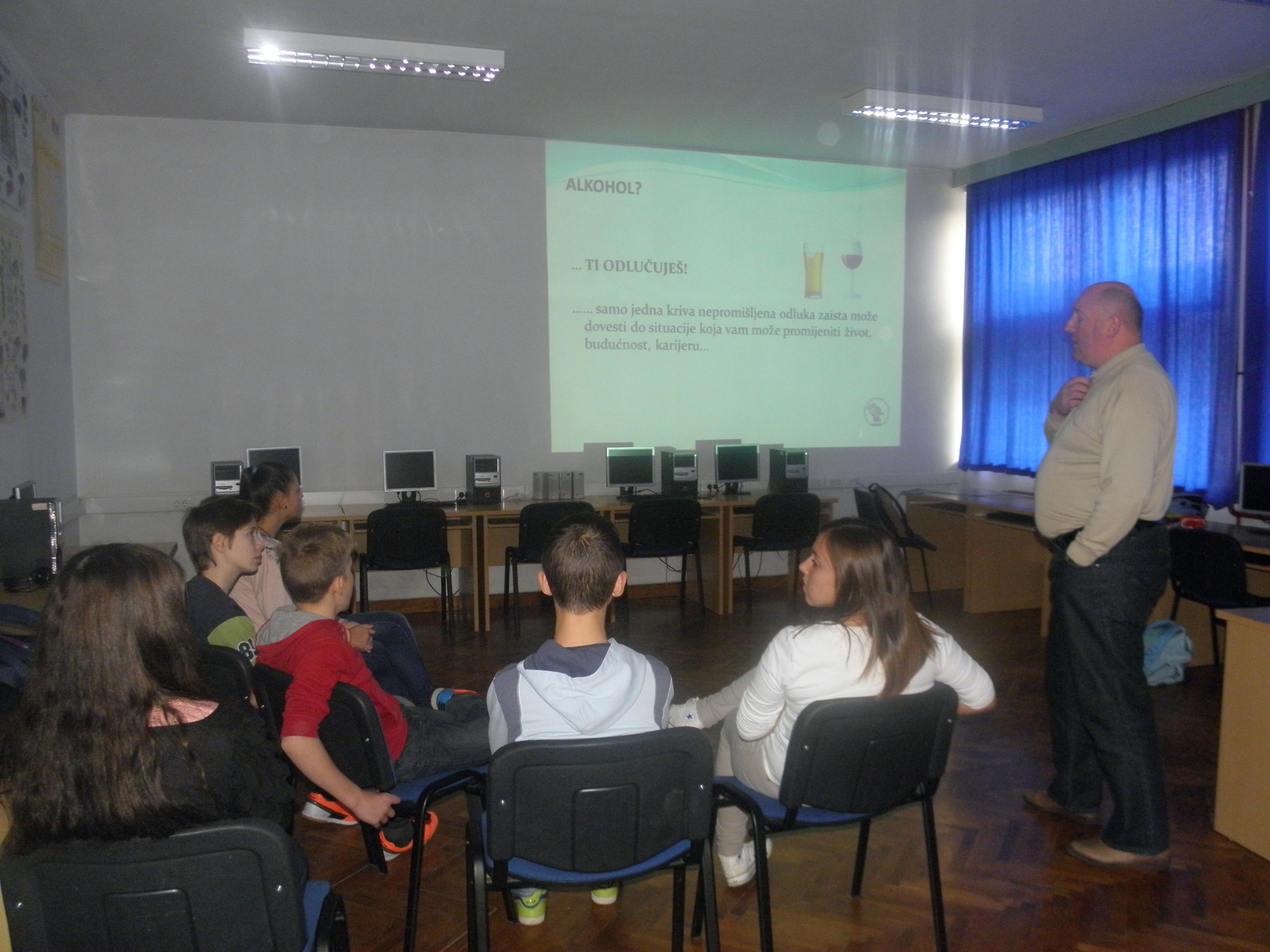Kroz predavanje učenicima je prezentirana problematika zlouporabe alkohola kroz primjere iz medija. Na primjerima prekršaja i kaznenih djela, kao što su narušavanje javnog reda i mira, uništavanje imovine, sudjelovanje u prometu na cestama pod utjecajem alkohola, nasilnička ponašanja, učenici su upoznati s postupcima policije i ostalih institucija, a posebno utjecaj takvih ponašanja na njihovu budućnost.