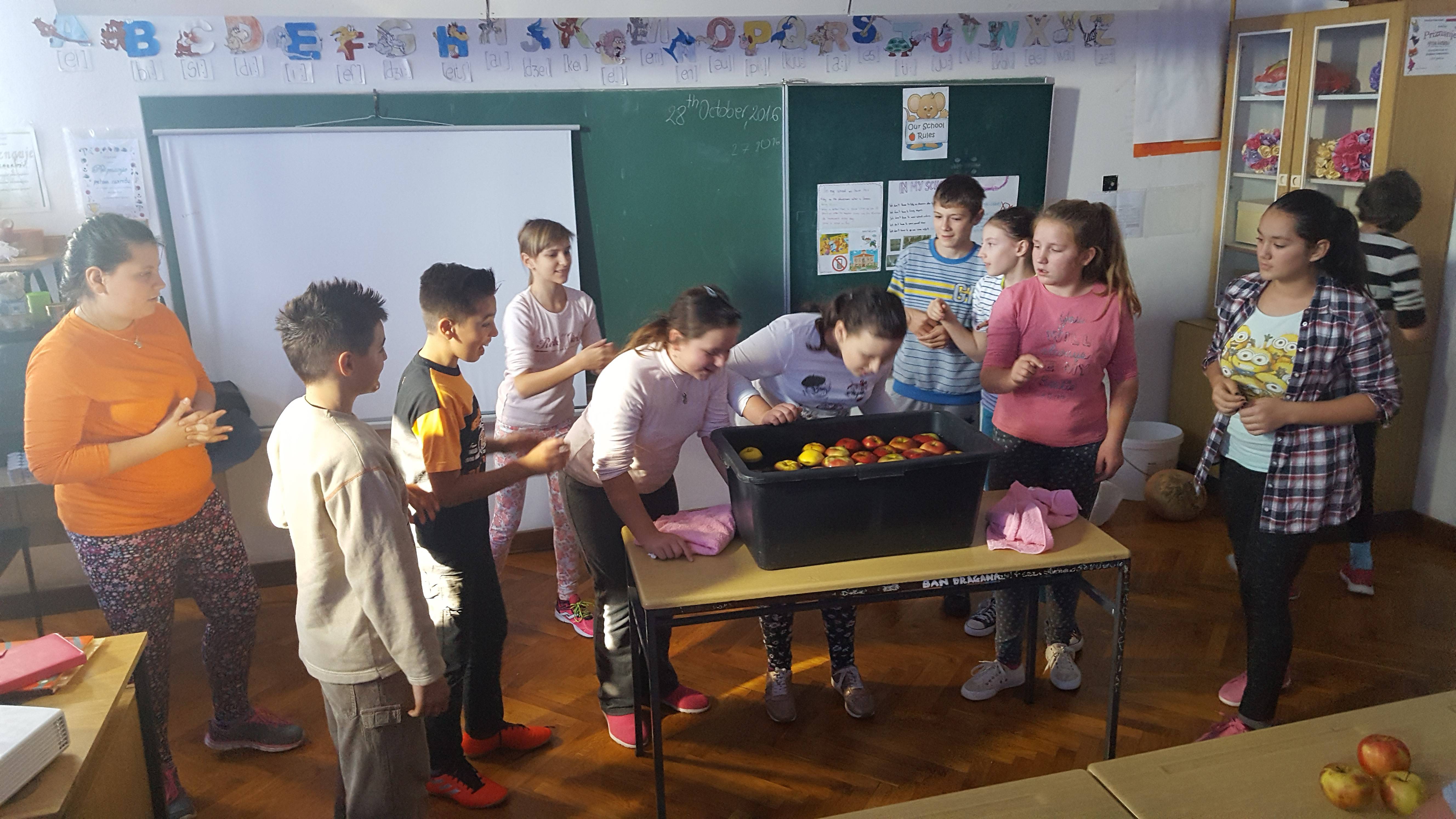 Igrajući igru Boobying for Apples učenici su pokazali i svoj natjecateljski duh, ali i snažnu volju za pobjedom. Niti uranjanje lica u vodu, kako bi se zubima uzela jabuka, nije ih spriječila da se lavovski bore za titulu najboljega. Lagano smo došli i do druge aktivnosti ove tematike, Jack-o-lantern. Izrezujući bundevu dobili smo nama željene motive.