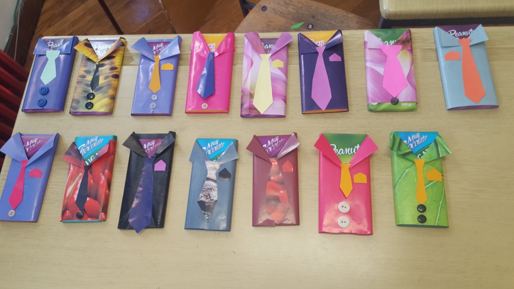 Uslijedila je radionica. Učenici su origami tehnikom napravili košulju i kravatu od papira različitih boja. Sljedeća aktivnost je bila obložiti čokoladu papirom i napraviti prigodnu kravatu. Učenici su mogli ukrašene čokolade uzeti i ponijeti kućama.