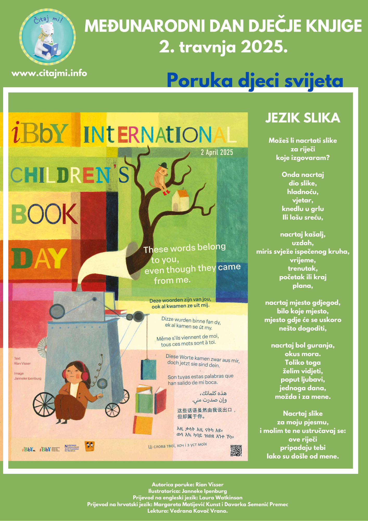 Međunarodni odbor za knjige za mlade (International Bord on Books for Young People - IBBY), neprofitno je udruženje koje obilježava ovaj događaj od 1967., a svake je godine pokrovitelj jedna od članica koja osmišljava poruku i poster za sve sekcije. Ove godine, 2025., to je IBBY Nizozemska, a naslov poruke za Međunarodni dan dječje knjige je Jezik slika. Poruku je napisala Rian Visser, a poster je likovno osmislila Janneke Ipenburg.