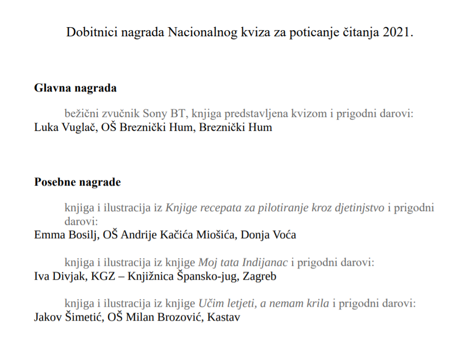 Na završnoj svečanosti Nacionalnog kviza za poticanje čitanja javno se izvlače glavna i utješne nagrade, uz prigodan kulturni program.