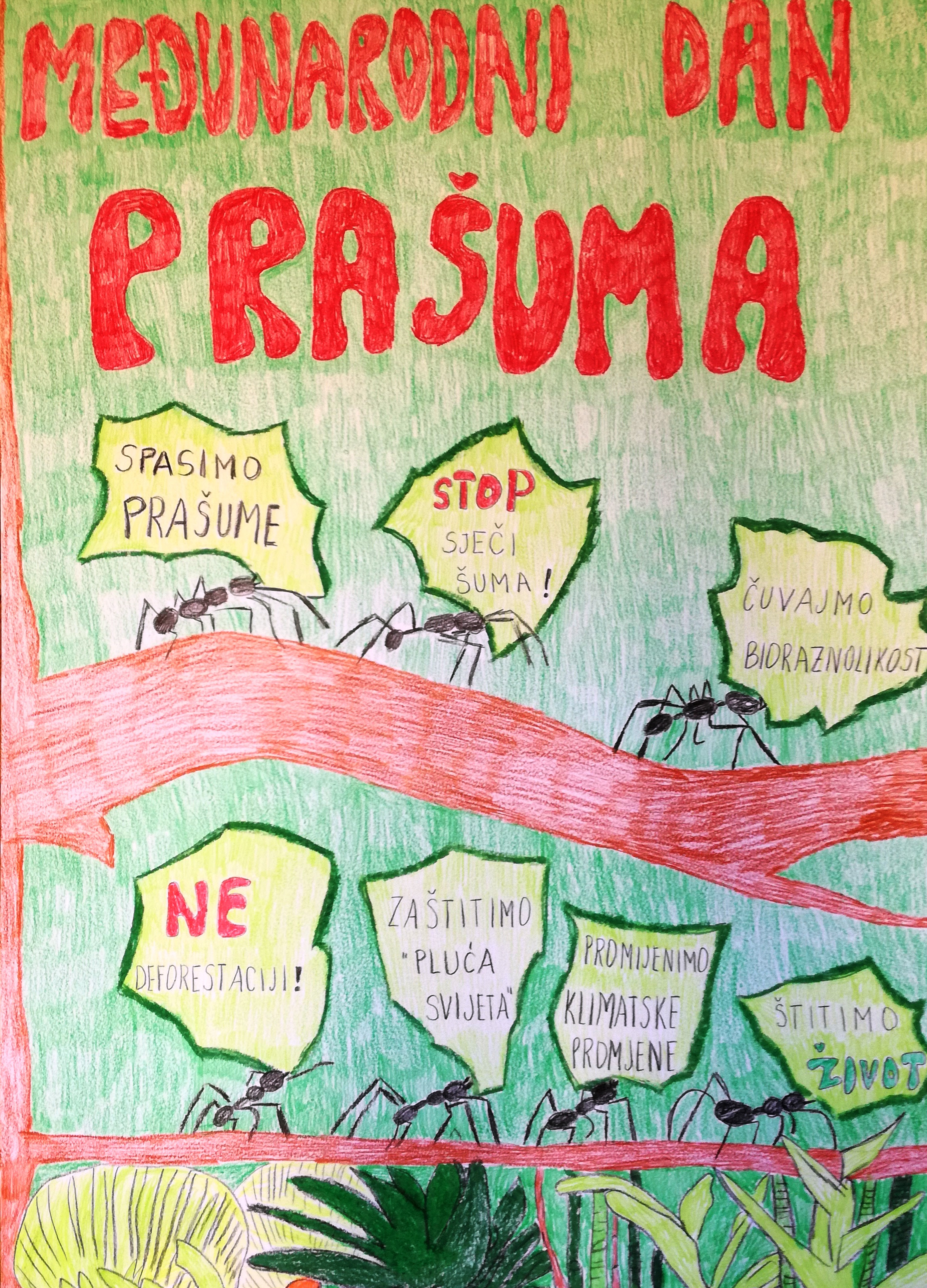 Kako bismo razumjeli vrijednost prašuma potrebno je uočiti njihovu ulogu na Zemlji. One imaju veliki utjecaj na kišu jer neravna površina njihova drveća stvara zračne turbulencije koje povećavaju količinu vode koja hlapi iz šume. Ona stvara oblake koji se prazne u obliku kiše. Ako šume nestane, padat će manje kiše, brže će se osušiti tlo, a temperatura zraka i tla će rasti. Također, zelene biljke i drveće procesom fotosinteze iz ugljikovog dioksida oslobađaju kisik u zrak. Zbog toga se tropske prašume nazivaju „pluća svijeta“. Tropske prašume su ujedno i dom nebrojenim biljnim i životinjskim vrstama.Zbog svega navedenog očuvanje tropskih šuma od velike je važnosti. Njihovo uništavanje pridonosi problemu globalnog zagrijavanja. Isto tako ono znači opasnost i izumiranje za mnoge životinjske i biljne vrste. Svake minute u danu uništi se 40 000 m2 tropske prašume i to paljenjem, sječom ili čupanjem iz korijena zbog čega svaki dan izumire nekoliko biljnih i životinjskih vrsta. Zbog toga su učenici osmislili i izradili plakat kako bi potakli svijest o potrebi očuvanja šuma i prašuma, u školi ali i šire.
