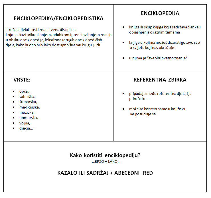 Enciklopedička djela pripadaju među referentna djela, tj. priručnike. Za razliku od primarnih izvora informacija, kakvi su npr. znanstveni članci, enciklopedička djela sadrže konsolidirane informacije, tj. odabrane, vrednovane, sažete i prikladno predstavljene informacije, što ih ujedno svrstava među tercijarne izvore informacija.