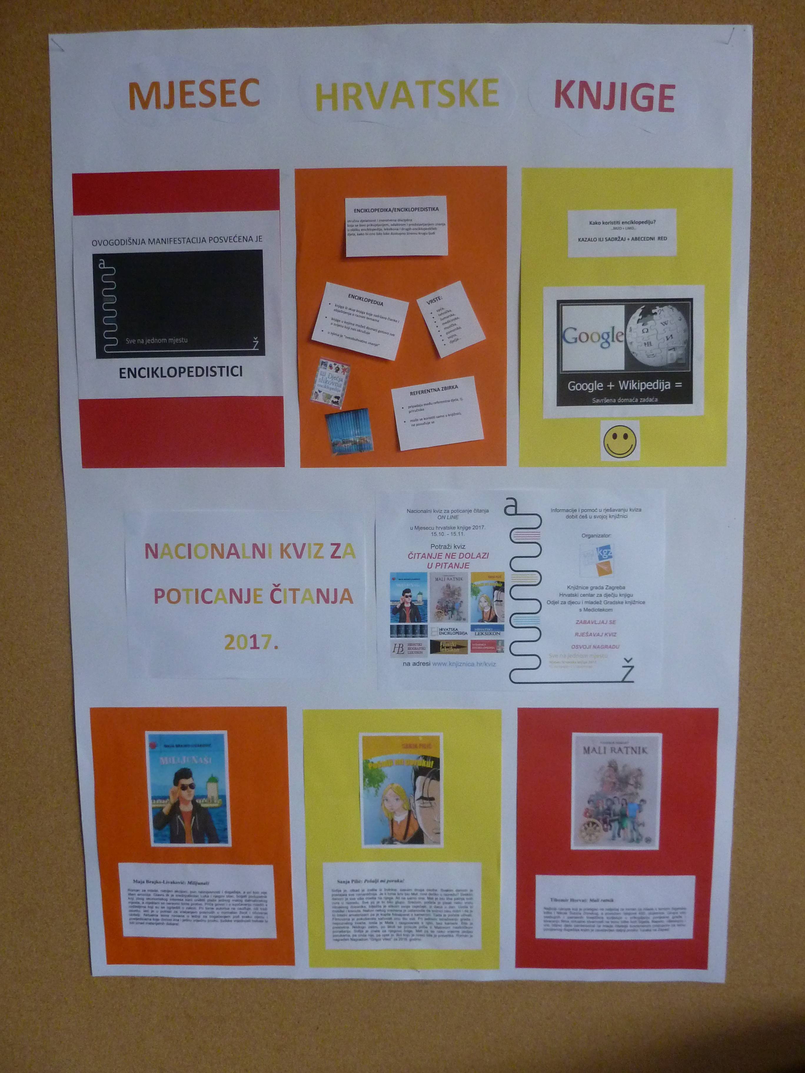 Mjesec hrvatske knjige, manifestacija koja promiče knjigu i čitanje, održava se od 15. listopada do 15. studenoga svake godine. Ovogodišnja tema je enciklopedistika. Enciklopedika ili enciklopedistika stručna je djelatnost i znanstvena disciplina koja se bavi prikupljanjem, odabirom i predstavljanjem znanja u obliku enciklopedija kako bi ono bilo lako dostupno širemu krugu ljudi. Enciklopedička djela pripadaju među referentna djela, tj. priručnike. Za razliku od primarnih izvora informacija, kakvi su npr. znanstveni članci, enciklopedička djela sadrže odabrane, vrednovane, sažete i prikladno predstavljene informacije. Iako je geslo “Sve na jednom mjestu!” ne smijemo zaboraviti da znanje ne možemo staviti unutar okvira jer se ono konstantno mijenja, proširuje se i produbljuje, dolazimo do novih otkrića i spoznaja.