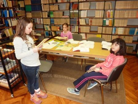 Učenici nižih razreda čitaju poezije u školskoj knjižnici.