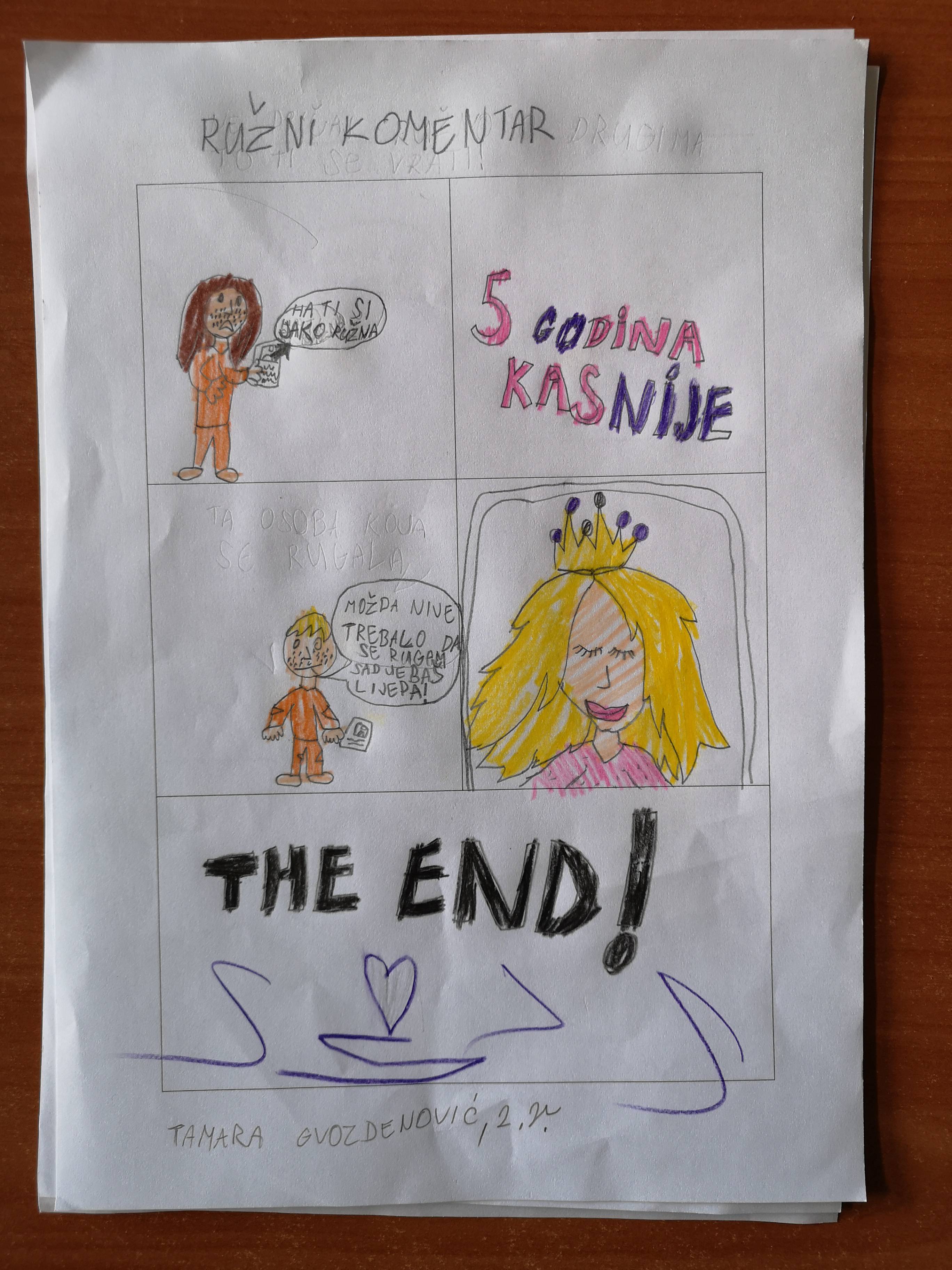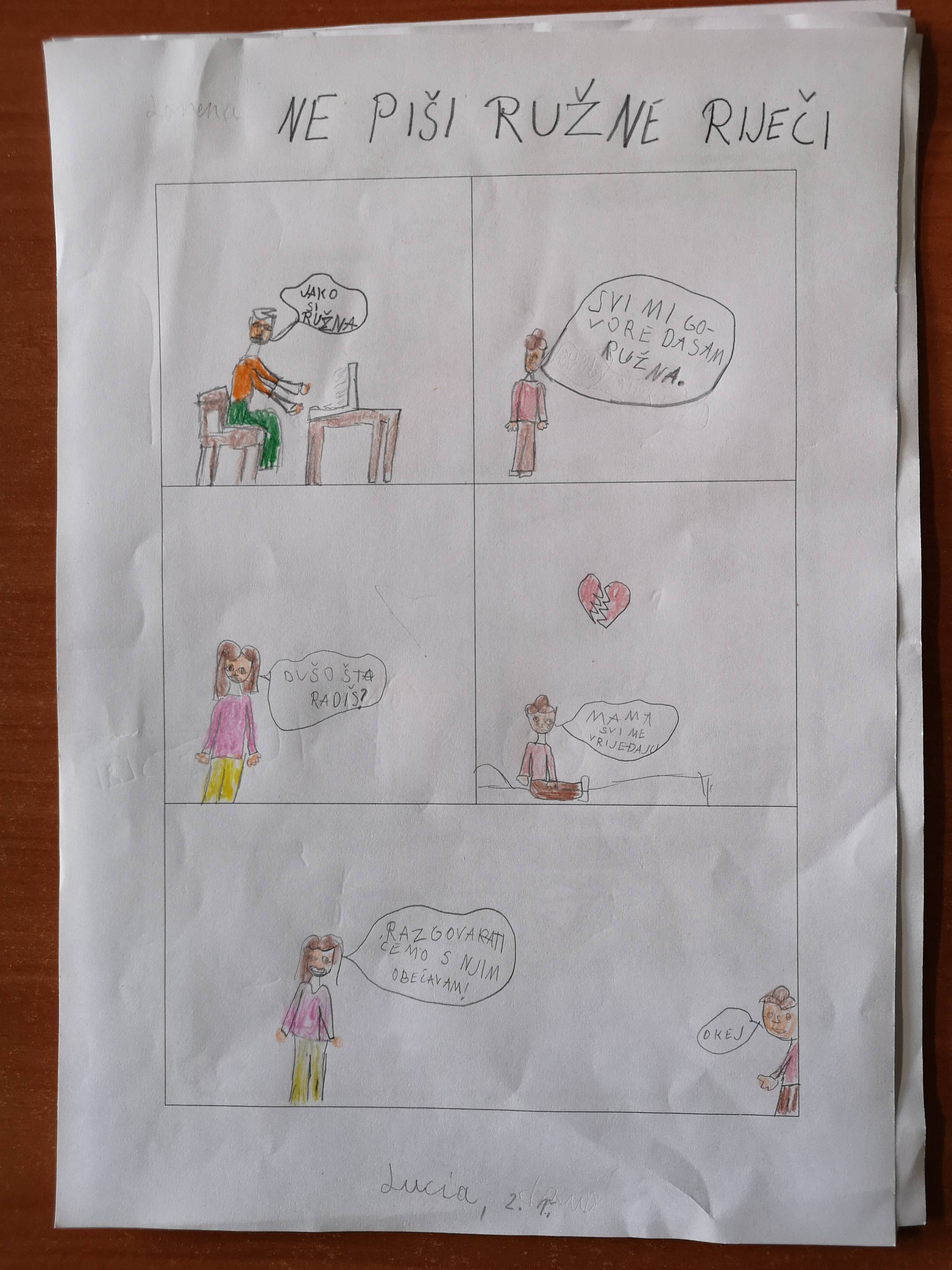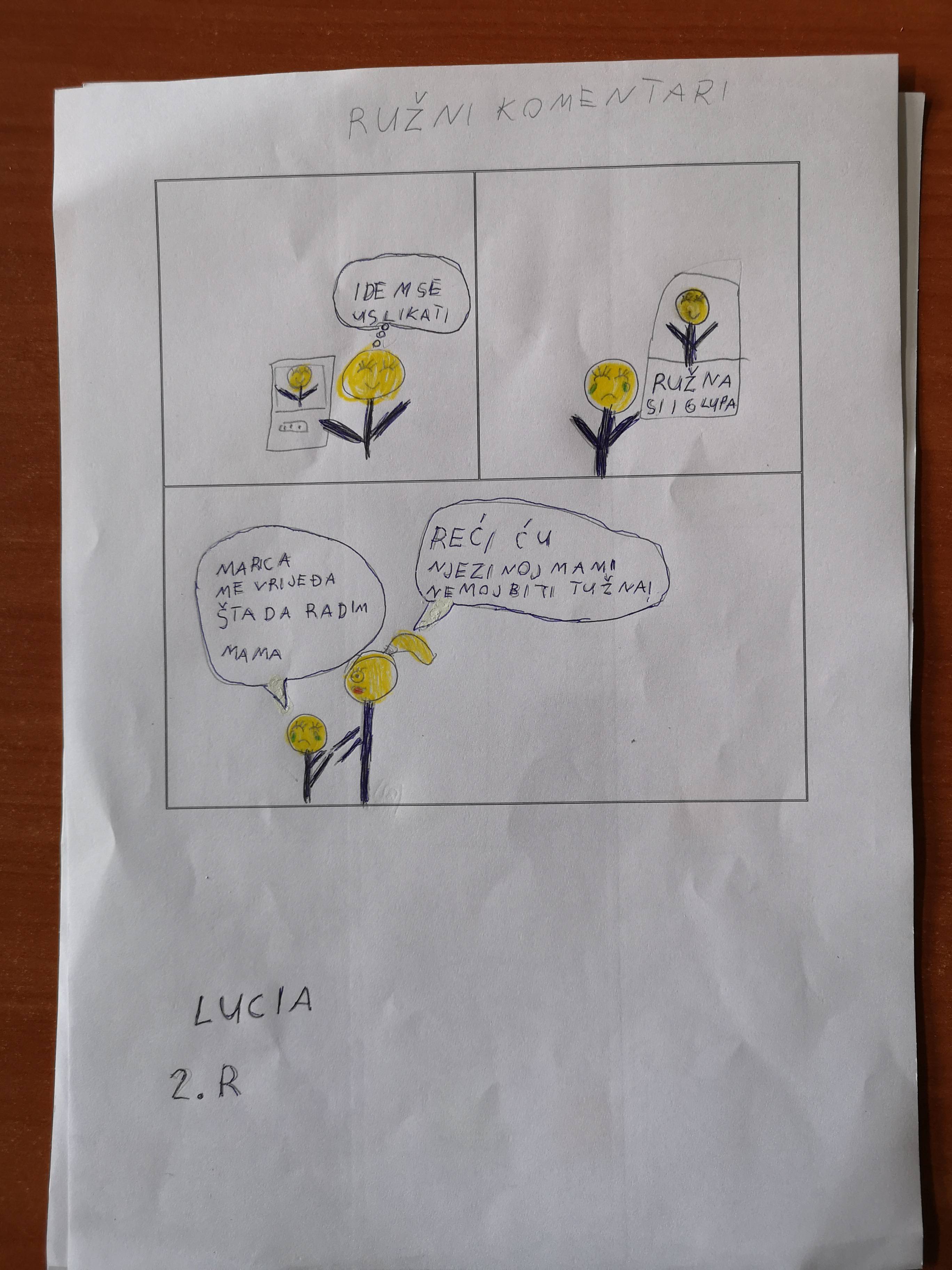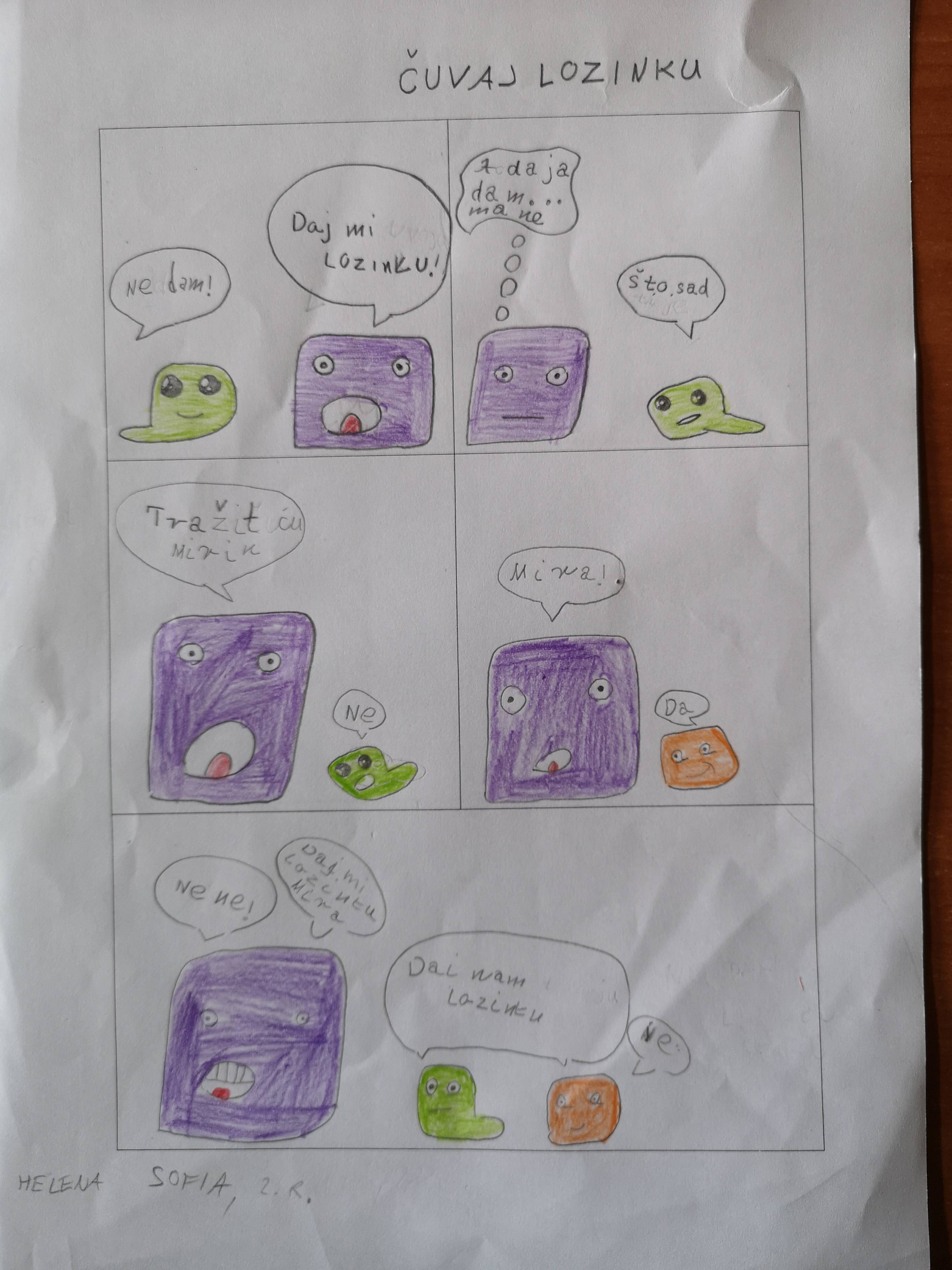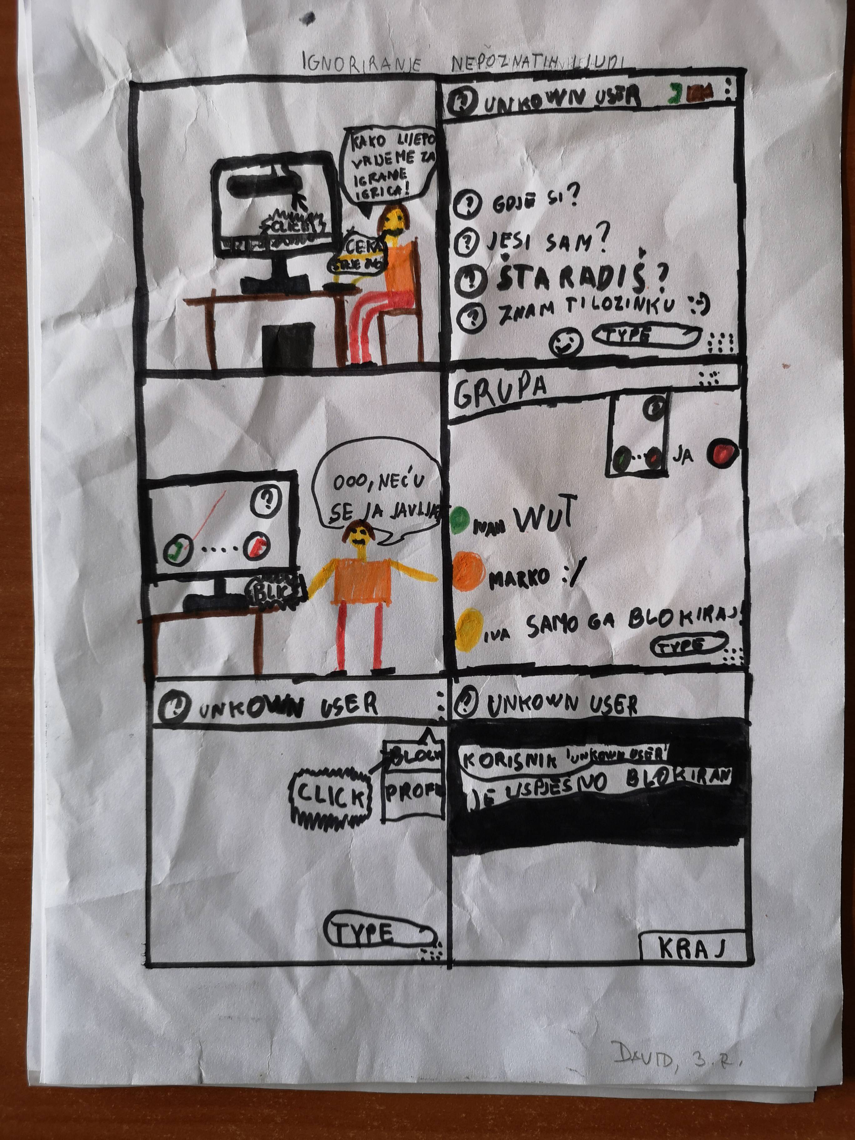 Nakon što su pogledali prezentaciju o nasilju na internetu učenici su upoznati s oblicima e-nasilja te strategijama suočavanja s problemom nasilja na internetu. To su prikazali i u stripovima koje su osmislili i nacrtali.