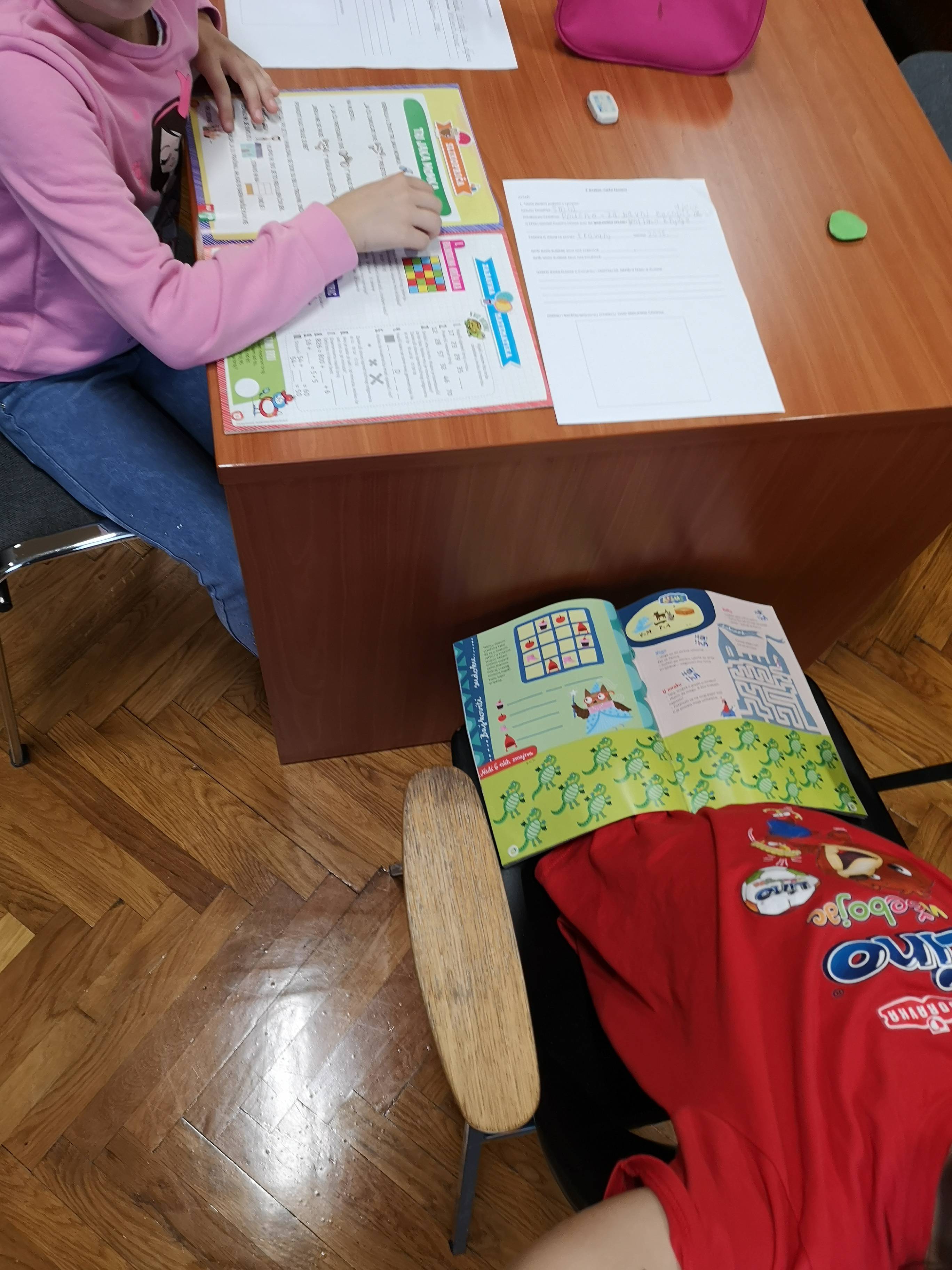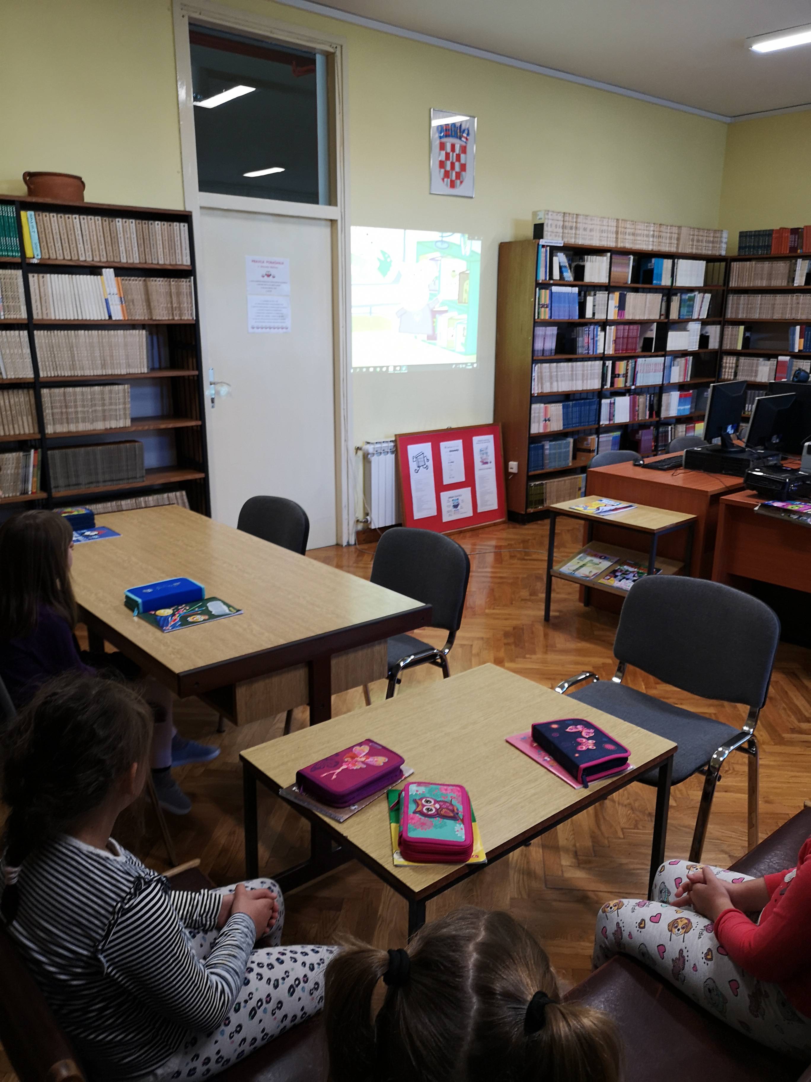 1. razred gleda animirani film Praščić Peppa, epizoda Knjižnica