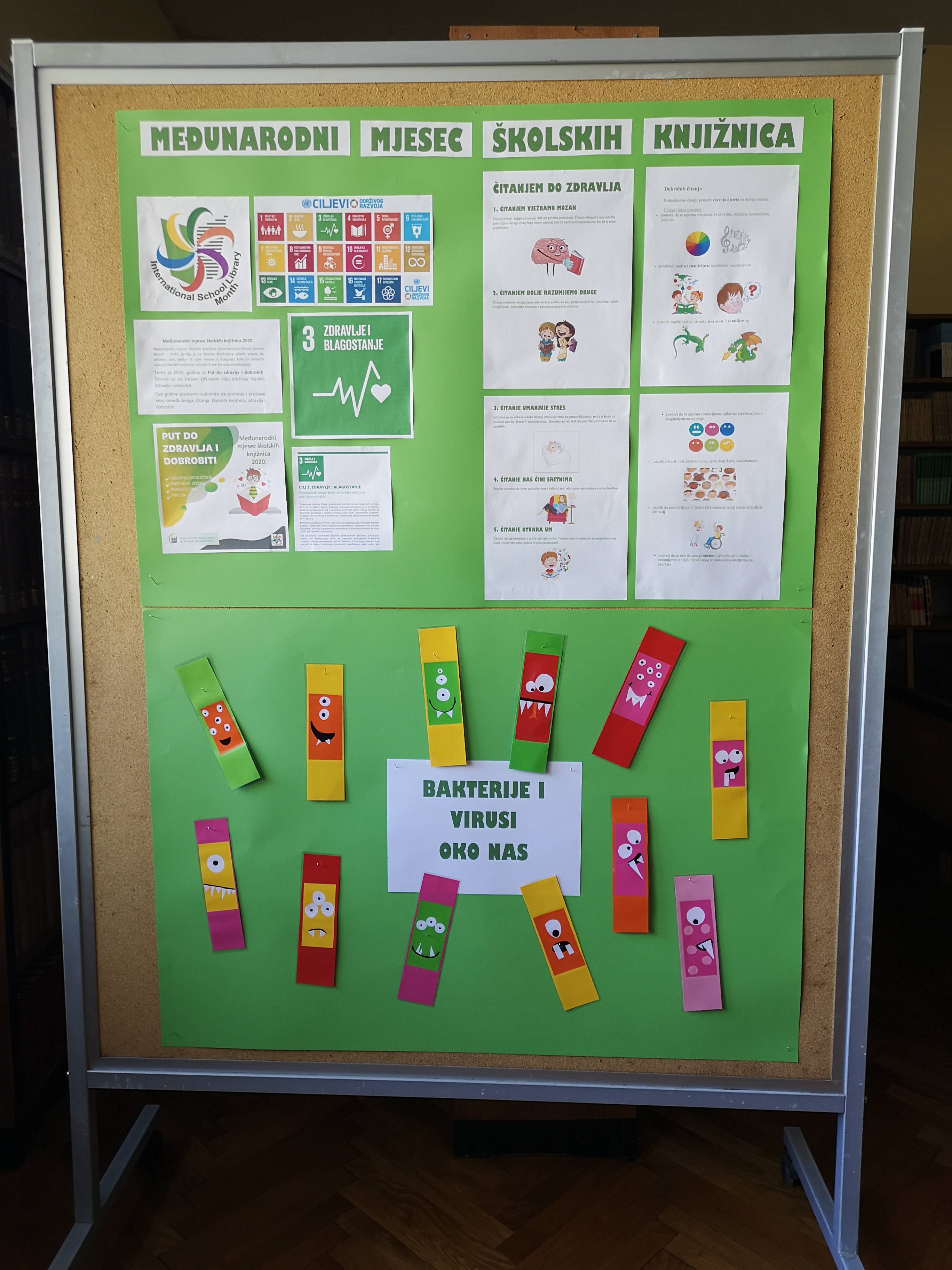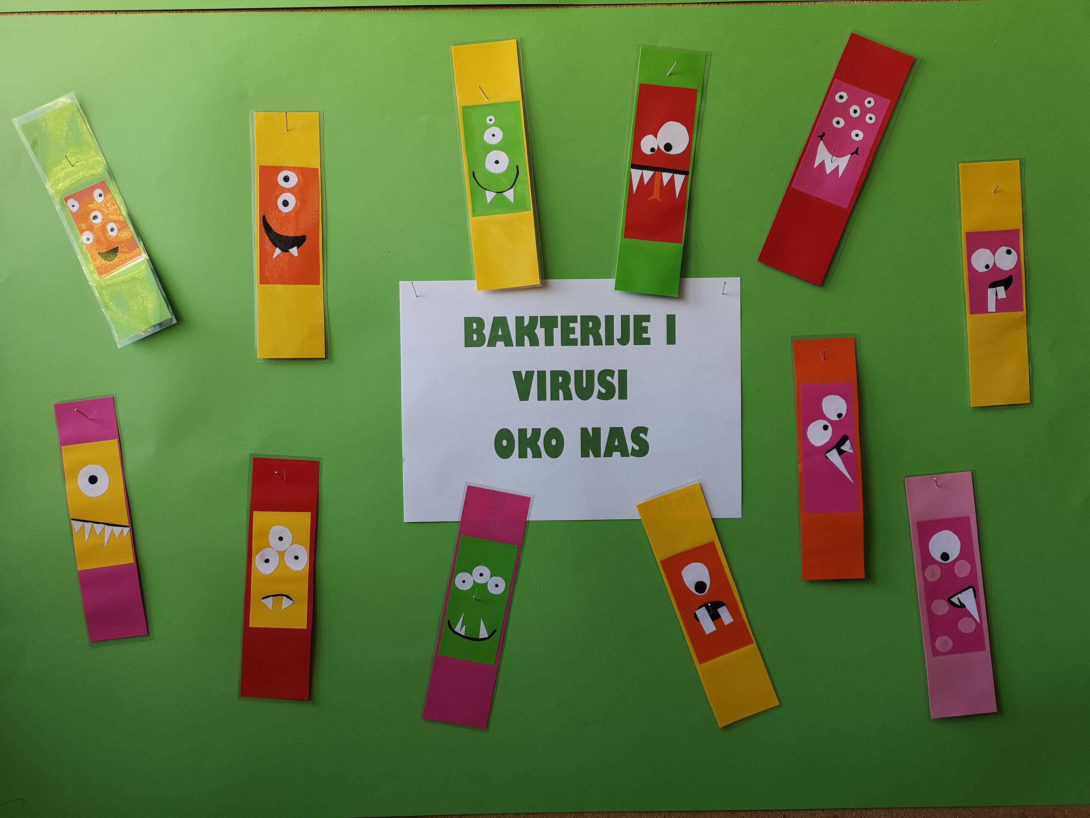 Učenici su u školskoj knjižnici izradili straničnike s likom virusa i bakterija kako bi nas podsjetili da su virusi i bakterije svuda oko nas i da se svi moramo pridržavati smjernica za očuvanje zdravlja.