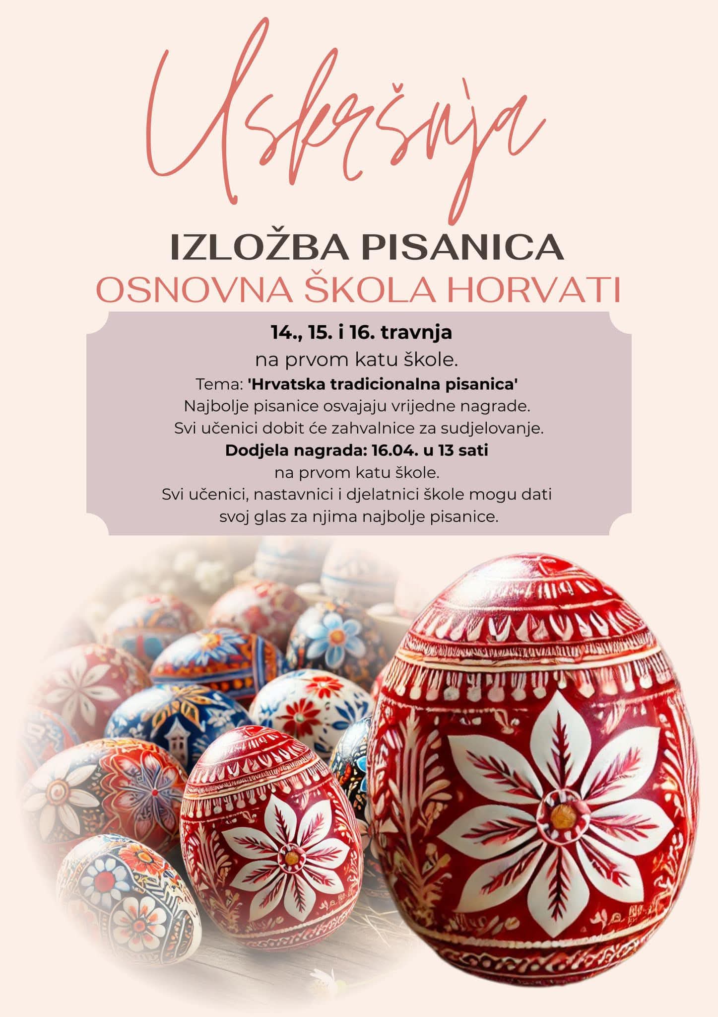 U našoj školi održana je uskrsna izložba pisanica od 14. do 16. travnja 2025.godine. Sudjelovali su svi učenici naše škole i istaknuli su se svojim radom. Ovogodišnja tema je bila tradicionalna hrvatska pisanica.