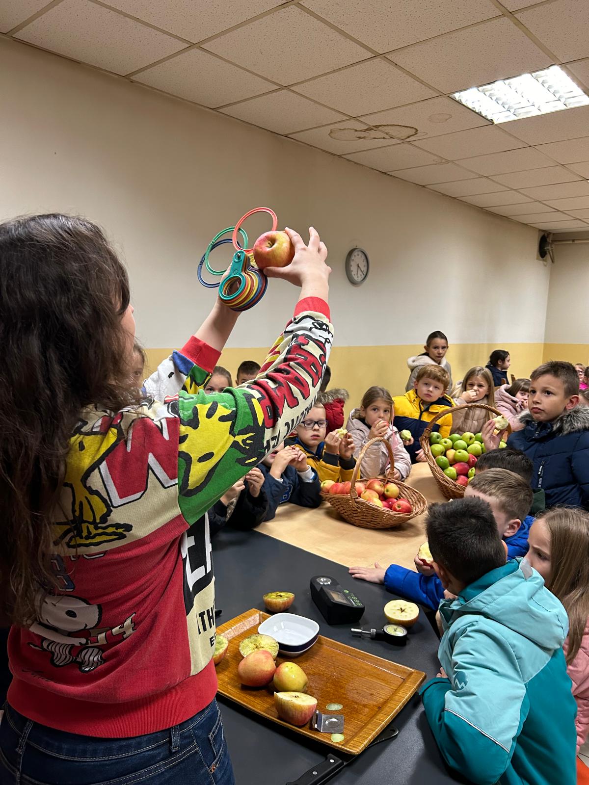 Taj cjelokupan „put jabuke“ prvašićima je na njima razumljiv način pokazivala i govorila mlada tehnologinja Iva Pocrnić, a mladi tehnolog Josip Ćurak im je govorio i o bananama na samom kraju ove iznimno poučne izvanučioničke nastave.