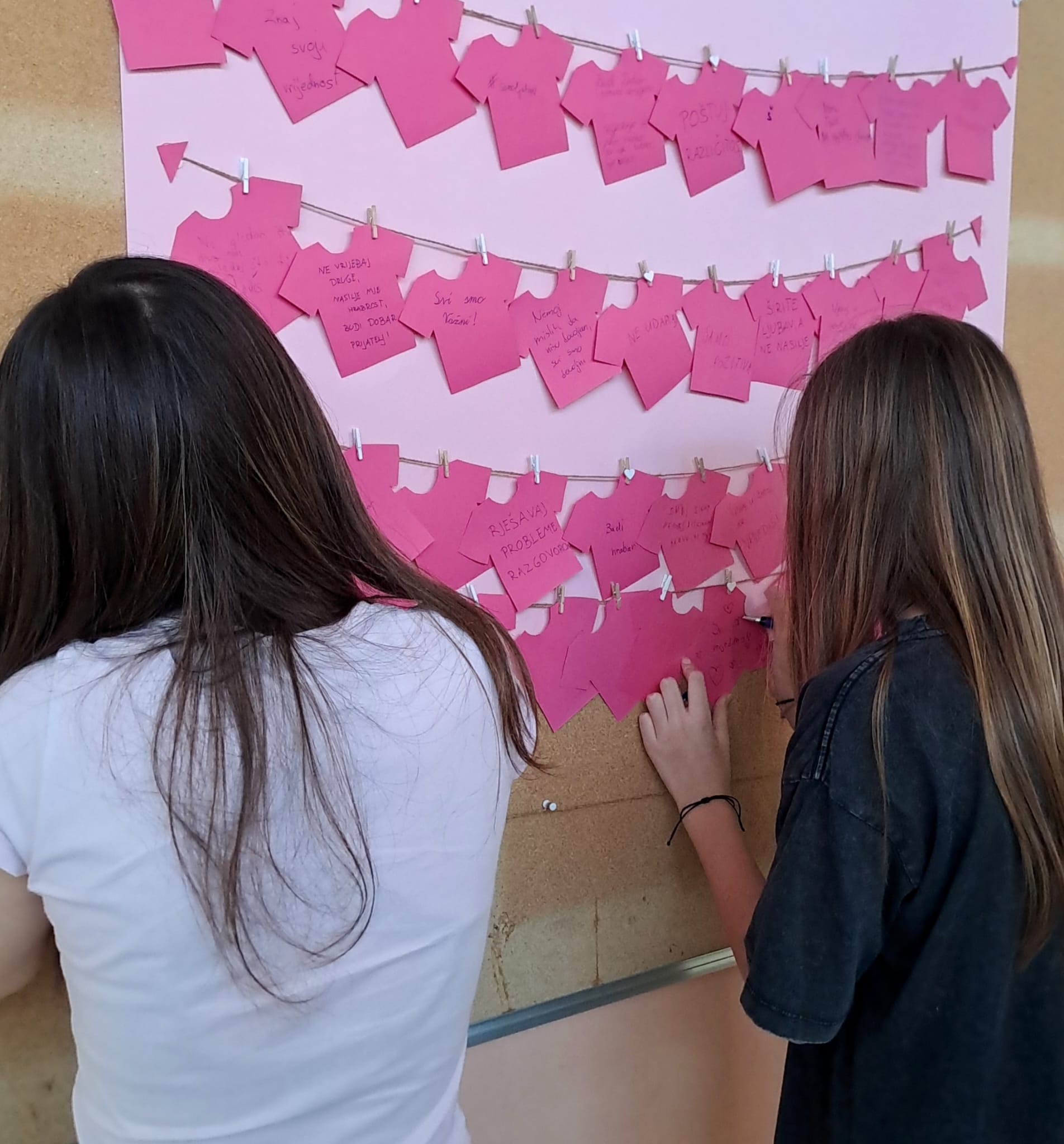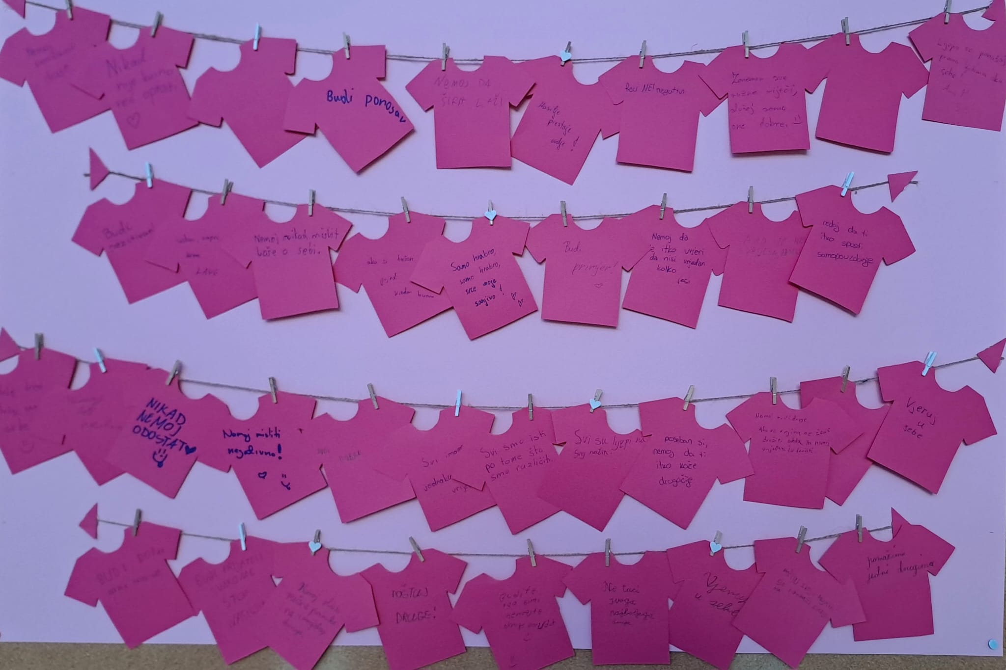 Na današnji dan obilježili smo dan borbe protiv vršnjačkog nasilja. Ovaj dan poznatiji kao dan ružičastih majica obilježava se 26.2. Čekali smo povratak učenika s praznika kako bismo ga zajedno obilježili.