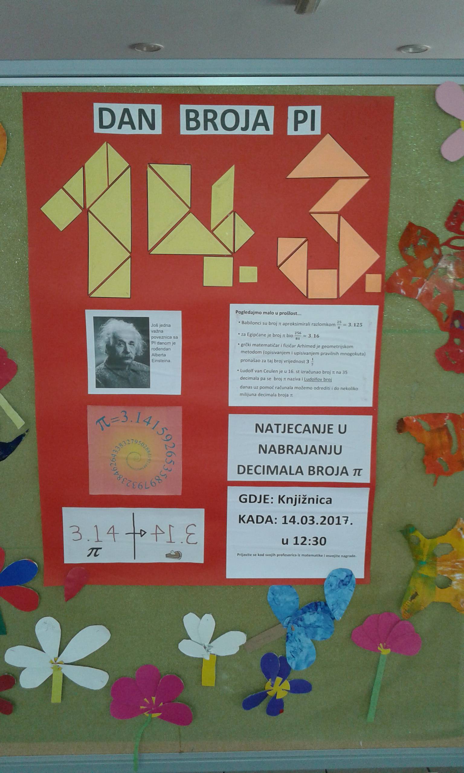 povodom obilježavanja Dana broja π pozivamo vas u knjižnicu 14.3. 2017. godine u 12.30 sati na Natjecanje u nabrajanju decimala broja π. Svi učenici koji žele sudljelovati na Natjecanju moraju se prijavati kod svojih učiteljica iz matematike.