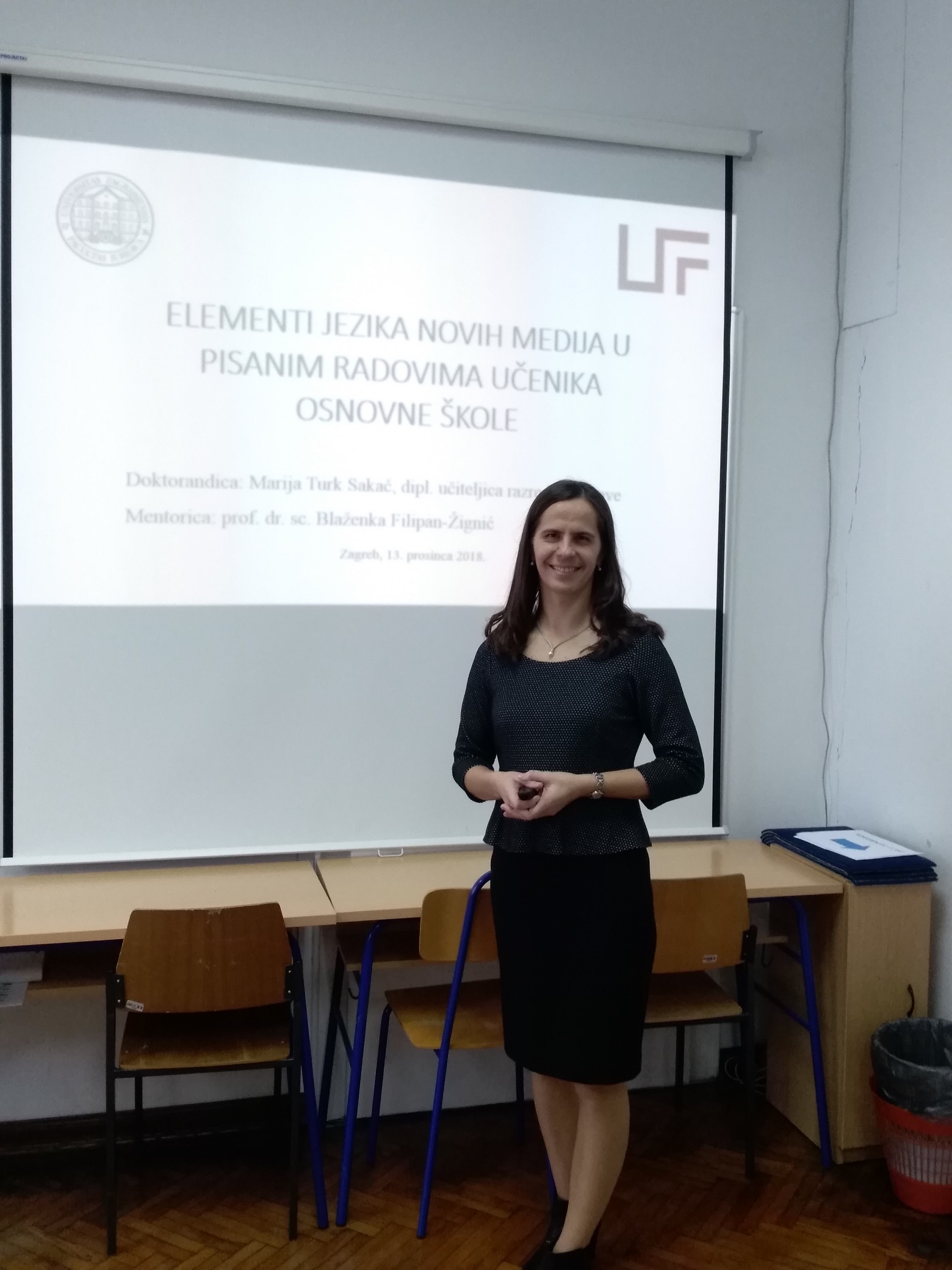 Pred četveročlanim Povjerenstvom za ocjenu i obranu doktorskog rada u sastavu: prof. dr. sc. Milan Matijević (predsjednik), doc. dr. sc. Vladimir Legac (član), doc. dr. sc. Ines Virč (članica), prof. dr. sc. Blaženka Filipan-Žignić (mentorica) te publikom u obiteljskom i kolegijalnom sastavu, učiteljica Marija Turk Sakač je obranila svoj doktorski rad s temom: „Elementi jezika novih medija u pisanim radovima učenika osnovne škole“.