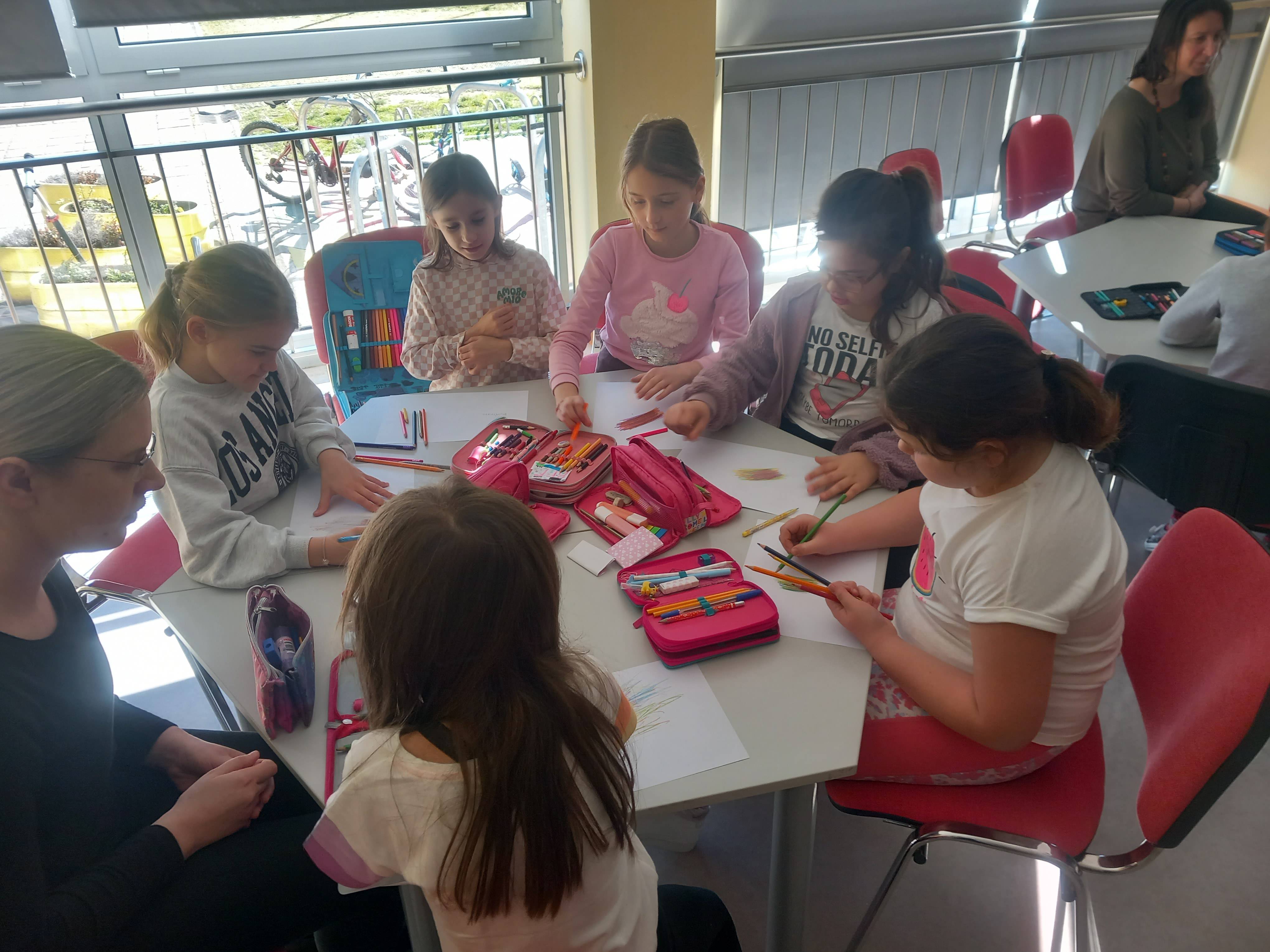 Mi smo danas s Jelenom upoznali djevojčicu Tonku i njene Sutriće te nas je svojom glumom, spontanošću i jednostavnošću zaista oduševila. Poput Tonke iz priče, i mi smo danas stvarali svoje nove boje i dobro se zabavili.