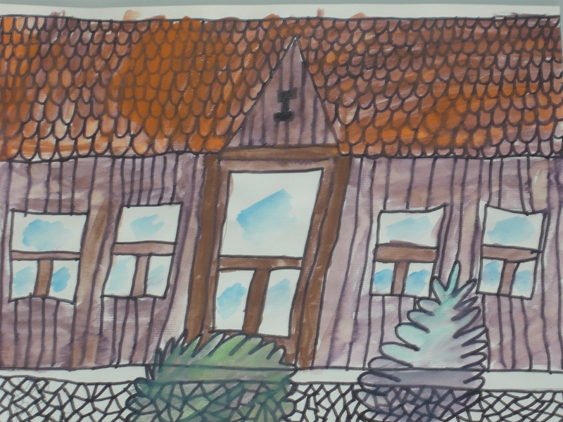 Sara je naslikala staru dugoselsku kuću tehnikom crni flomaster + akvarel.