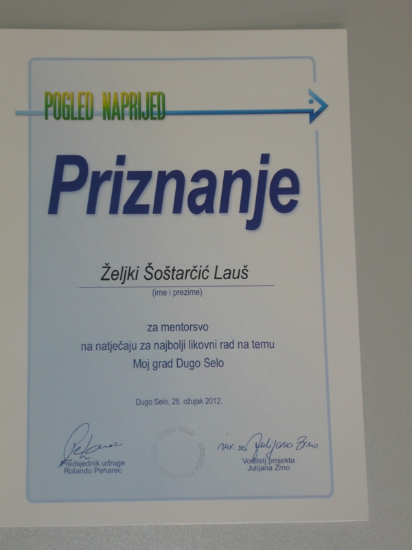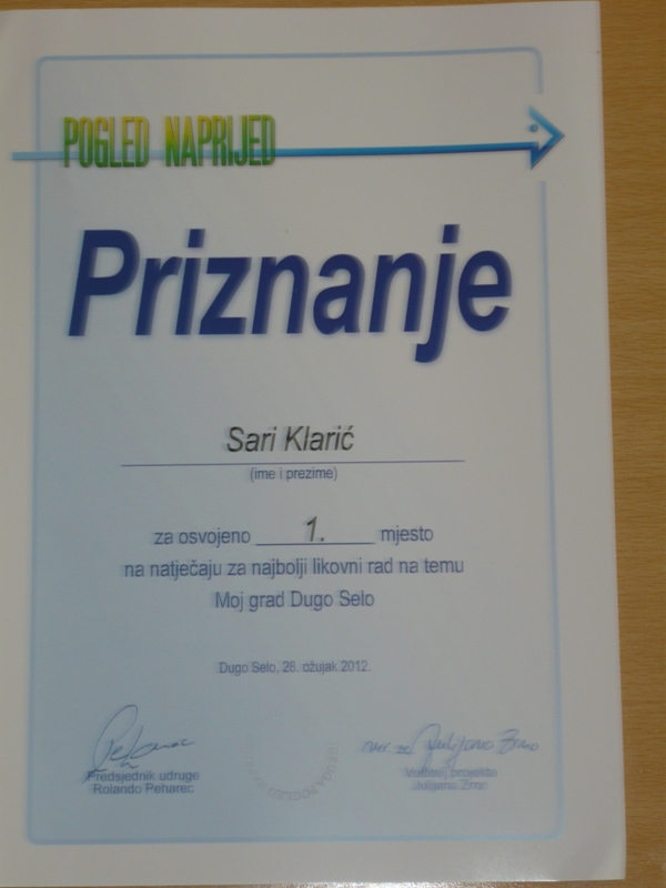 Sara Klarić, učenica 1.c razreda na natječaju kojeg je raspisala udruga Pogled naprijed, osvojila je 1. mjesto za najbolji likovni rad u kategoriji učenika/ca od 1.- 4. razreda na temu Moj grad Dugo Selo.