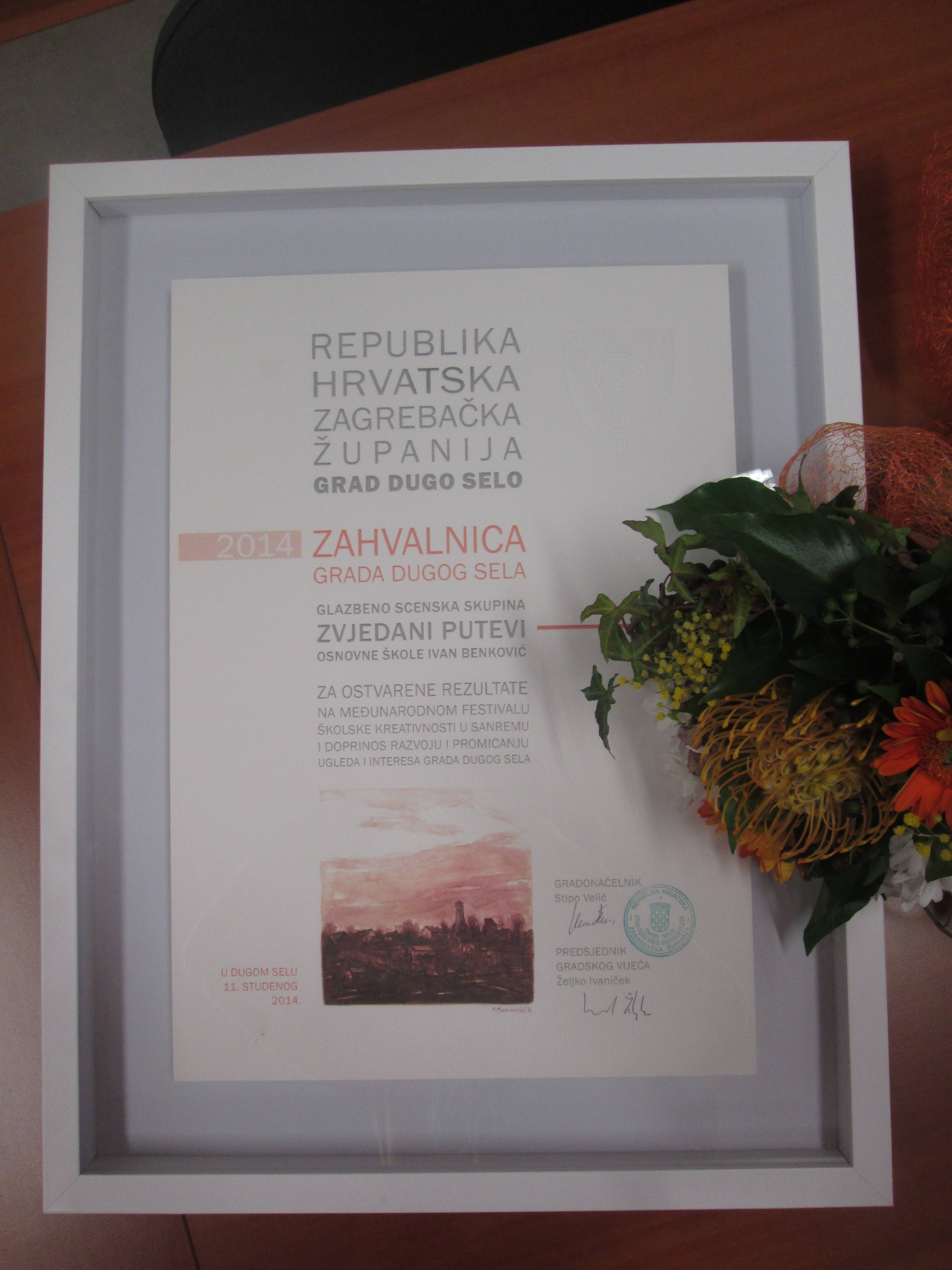 U utorak 11. studenoga 2014. na Svečanoj sjednici Grada Dugog Sela Zvjezdanim putevima – Briljantincima uručena je Zahvalnica Grada Dugog Sela za osvojeno prvo mjesto na Svjetskom festivalu školske kreativnosti u Sanremu i doprinos razvoju i promicanju ugleda i interesa Grada Dugog Sela. Zbog nemogućnosti prisustvovanja svih Briljantinaca na Sjednici, Zahvalnicu je u njihovo ime primila učiteljica Mirjana Pavlić.