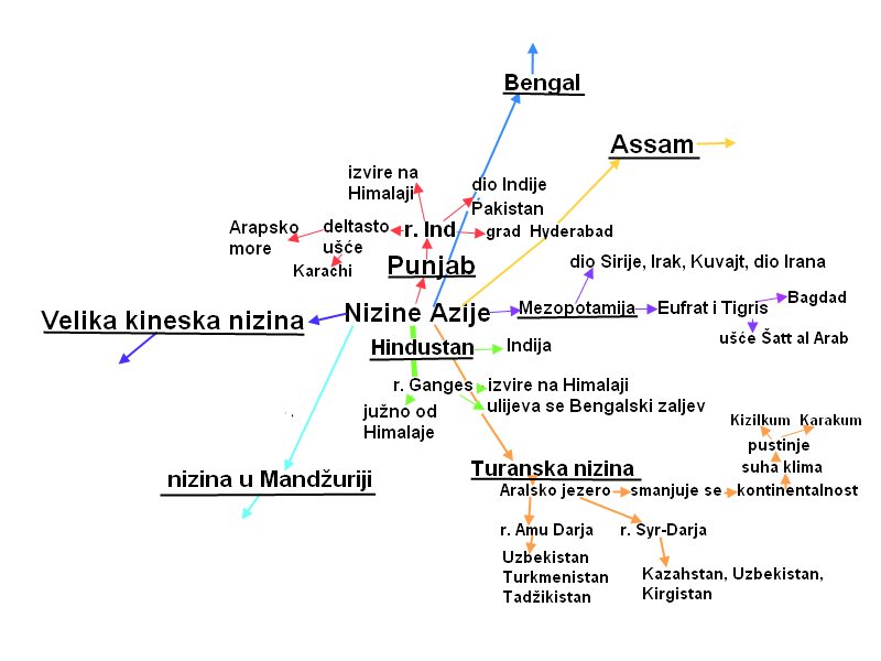 Prvi zadatak je umna mapa s temom nizina Azije. Na listu papira napravi svoju umnu mapu o nizinama. Za svaku nizinu koristi jednu bojom kojom ćeš povući strelice.