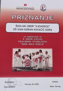 Školski zbor Vjeverice i Gradski dječji zbor HPD "Slavulj" imaju zajedničke pjevače i voditeljicu učiteljicu Glazbene kulture Maju Ostojić. Danas su se pjesmom predstavili na 8. Smotri dječjeg folklornog stvaralaštva Naše kolo veselo u organizaciji POU Hrvatskog doma Petrinja i FA Petrinjčica.