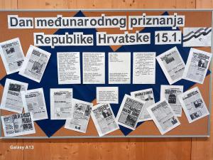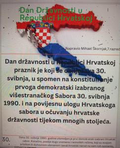 Učenici 7. razreda na satu Povijesti obilježili su Dan državnosti Republike Hrvatske. Učiteljica Nikolina Sukalić Rom prvo je učenike upoznala zašto se baš toga datuma obilježava taj državni praznik, a potom su digitalnim alatima izrađivali vremenske crte i postere.