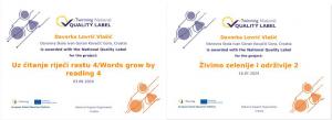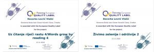 Učenici naše škole pod vodstvom učiteljice Davorke Lovrić Vlašić prošle školske godine sudjelovali su u eTwinning projektima „Uz čitanje riječi rastu 5” i „Živimo zelenije i održivije 3”. Marljivo su sudjelovali u raznim aktivnostima, a za uloženi trud i provedene aktivnosti nagrađeni su nacionalnim oznakama kvalitete.