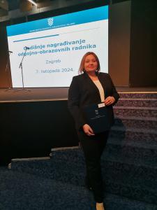 Javni poziv za nagrađivanje otvoren je u svibnju 2025. godine, a prijave je razmatralo Povjerenstvo sastavljeno od učitelja, nastavnika, stručnih suradnika, odgajatelja i ravnatelja ili osoba izabranih u znanstveno-nastavno, umjetničko-nastavno, znanstveno ili nastavno zvanje. I ove godine naša kolegica Davorka Lovrić Vlašić odabrana je u 522 najbolja odgojno-obrazovna djelatnika.Svečanost dodjele nagrada održana je u ponedjeljak, 6. listopada, na Zagrebačkome velesajmu. Nagrađenima je čestitao ministar znanosti, obrazovanja i mladih prof. dr. sc. Radovan Fuchs istaknuvši kako su izazovi koji se stavljaju pred zaposlene u obrazovanju svakim danom sve veći te zahtijevaju sve više vještina, kompetencija i zalaganja.