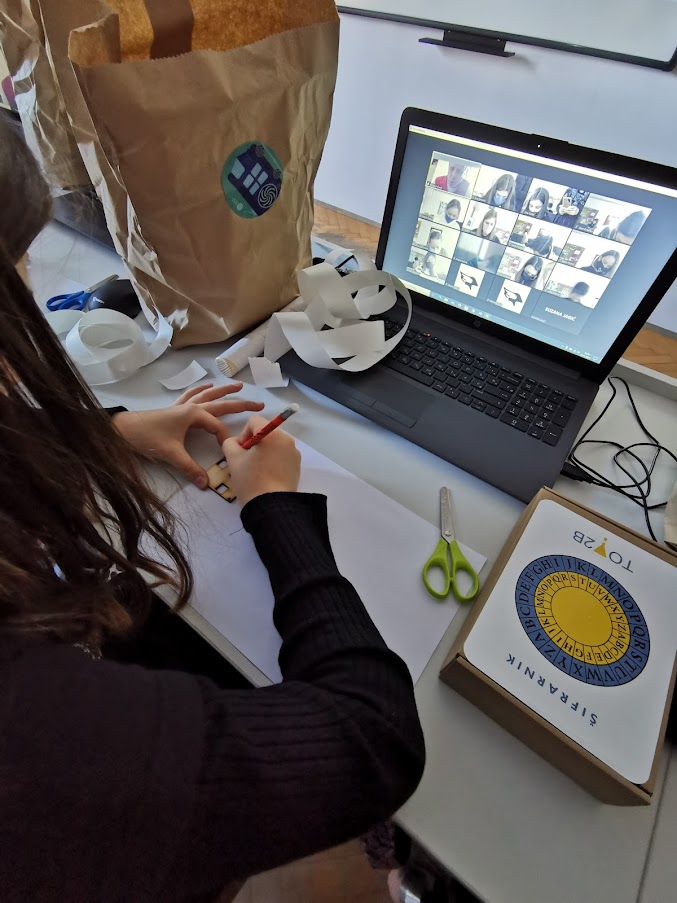 Sudjelovala sam na radionici Kriptografija. Dobili smo paket u kojem su bile stvari: škare, plastične čaše, štapić od drveta, drvena pločica s nekoliko rupa itd. S tim stvarima otkrivali smo šifre iz starijih vremena. To se sve odvijalo u učionici iz informatike jer smo se trebali spojiti preko zooma i slušati jednog učitelja koji nam je sve to objašnjavao. Bilo je jako zanimljivo i nadam se da će biti još puno sličnih radionica.